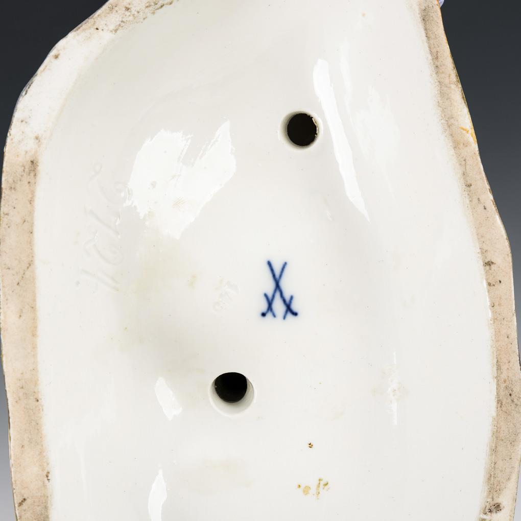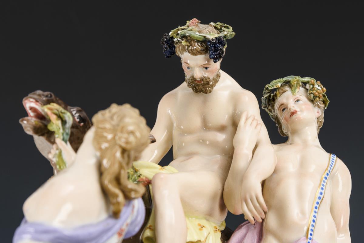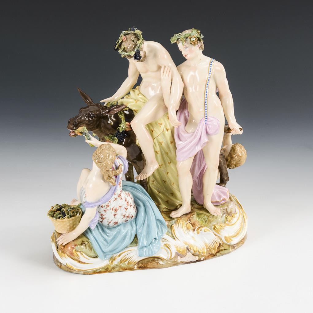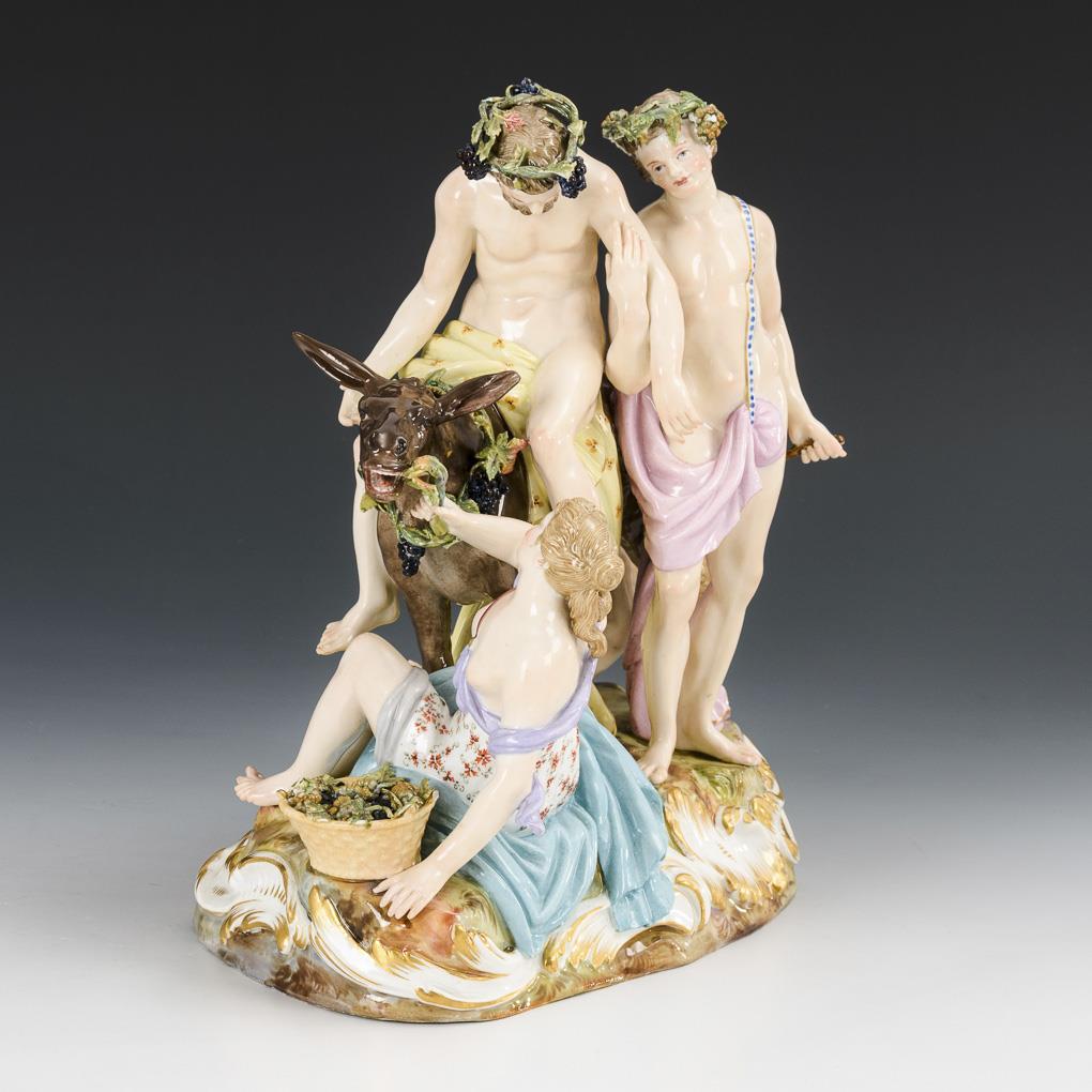 Auf einem Esel reitender, von einem Bacchanten, einer Bacchantin und einem Putto begleiteter Silen. H Eselkopf und -schwanz restauriert, Bestoßungen Blättern und Trauben, 1 Hand, 1 Zehspitze und 1 Ende einer Weinranke restauriert.