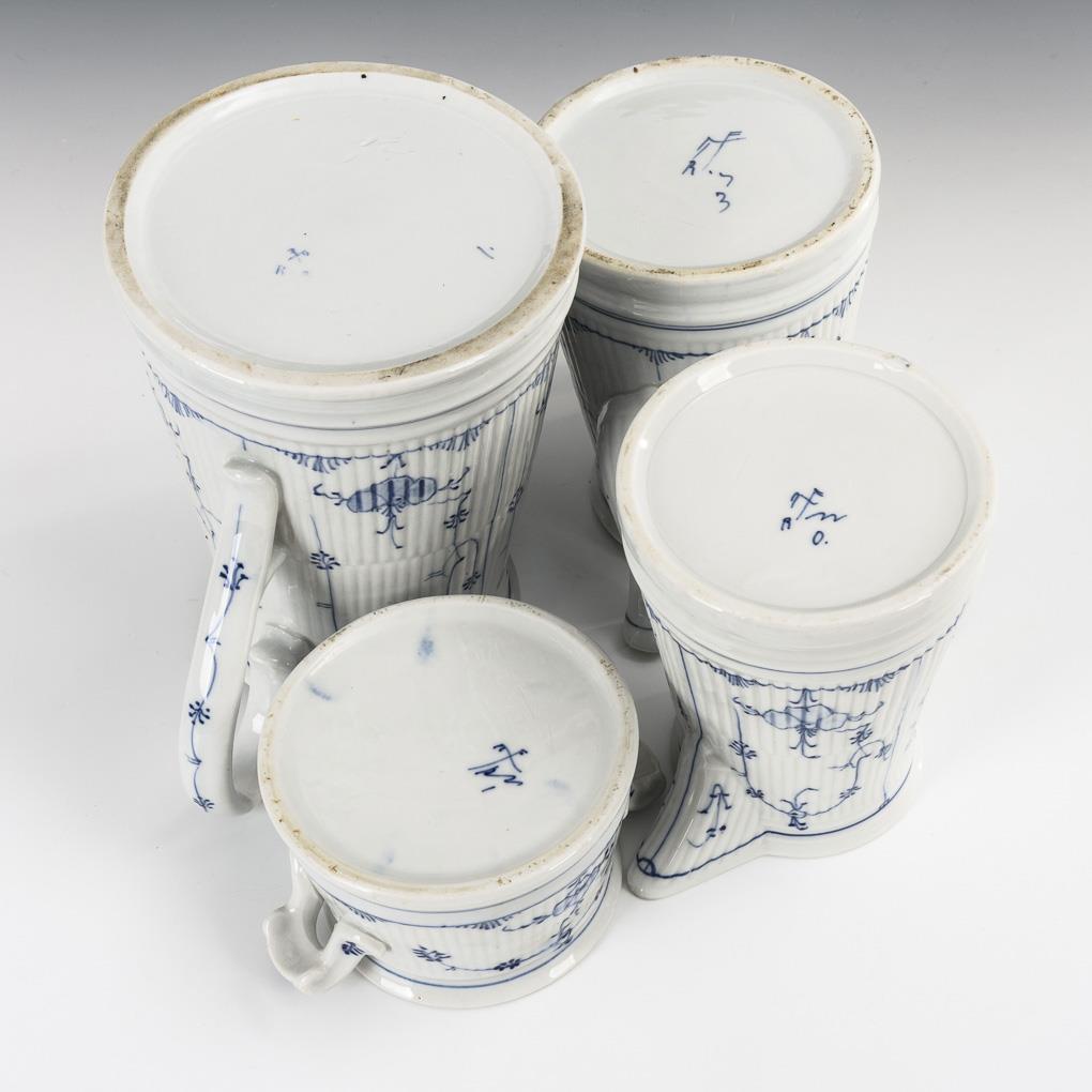 2 Kaffeekannen (1x ohne Deckel; H 22 und 16 cm), 1 Wasserkanne (H 15 cm) und 1 Zuckerdose (ohne Deckel; H 7,5 cm). Haarriss in der Schneppe der kleineren Kaffeekanne, Haarriss am oberen Henkelansatz der Wasserkanne.