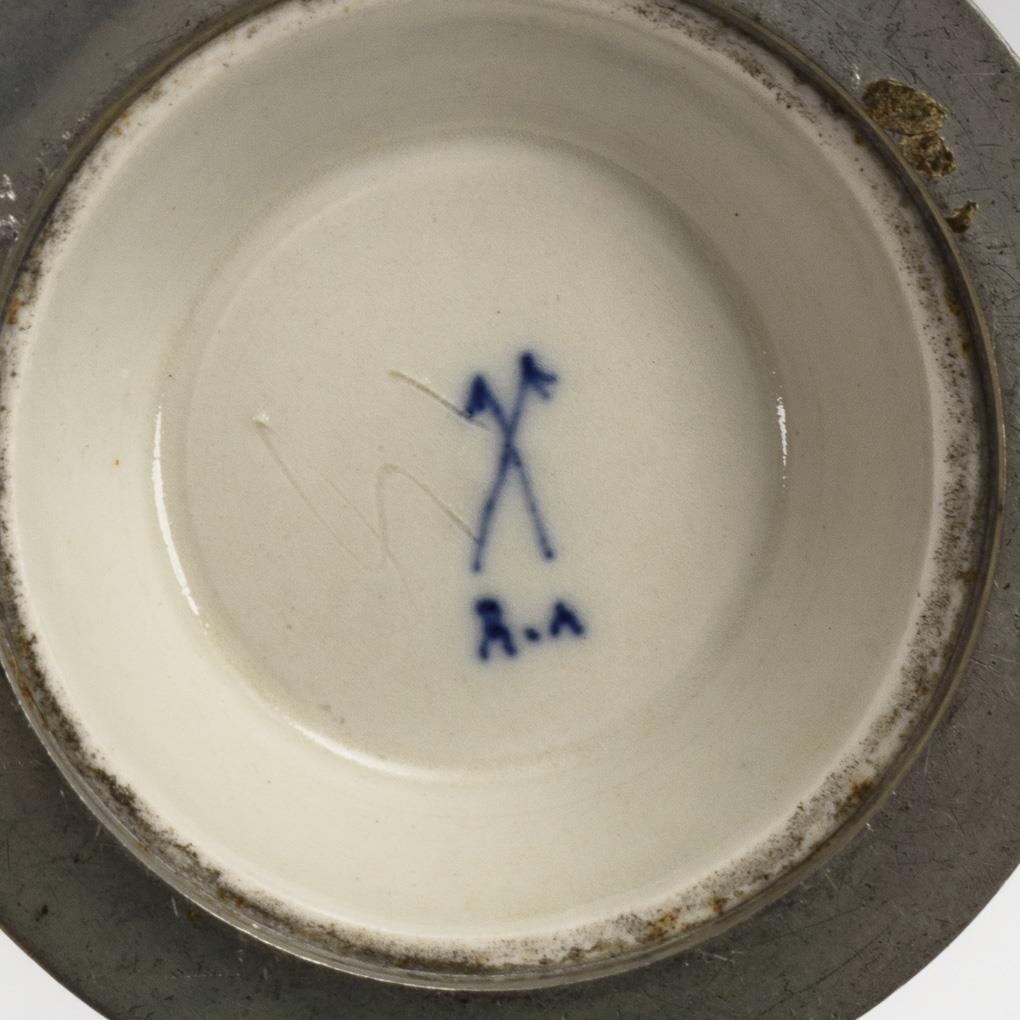 Birnkrug mit zinnmontiertem Stand und Scharnierdeckel (dieser mit Vogelmuster-Porzellaneinsatz). Haarriss im Henkel.
