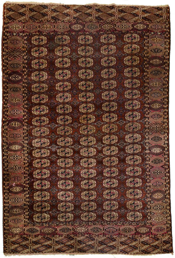 Gitterwerkdekor mit 5 x 17 Reihen aus großen Tekke-Güls und begleitenden Kurbaghe-Güls. Breite Bordüre mit einem Band aus strahlenförmigen Achtecken und turkmenischer Mustervielfalt. Schmalseiten mit abschließendem Rautendekor, kurzem Kelim und Fransen. Alters- und Gebrauchsspuren, teils Löcher und Reparaturen im Gewebe, teils abgenutzter und verblichener Flor, defekte Fransenabschlüsse.