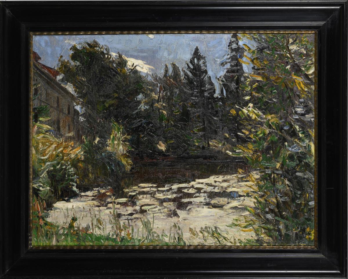 Mit pastosem, grobem Pinselduktus ausgeführte Ansicht des Gewässers nahe dem Schloss.