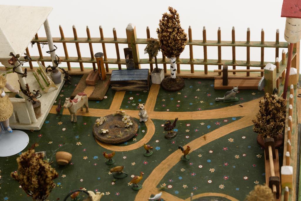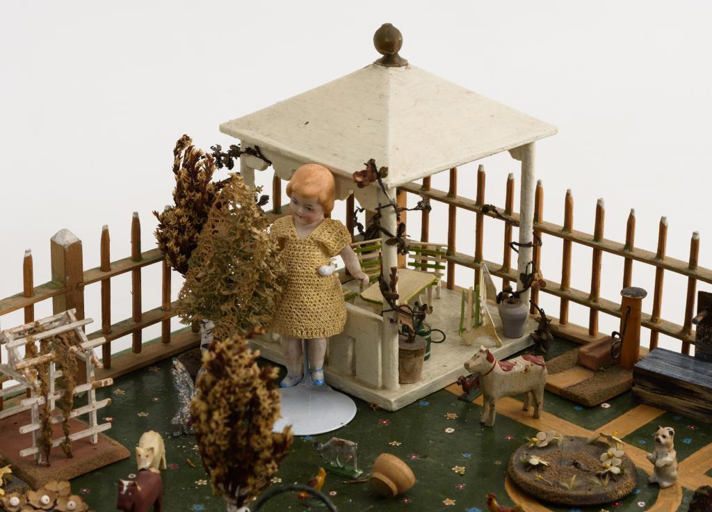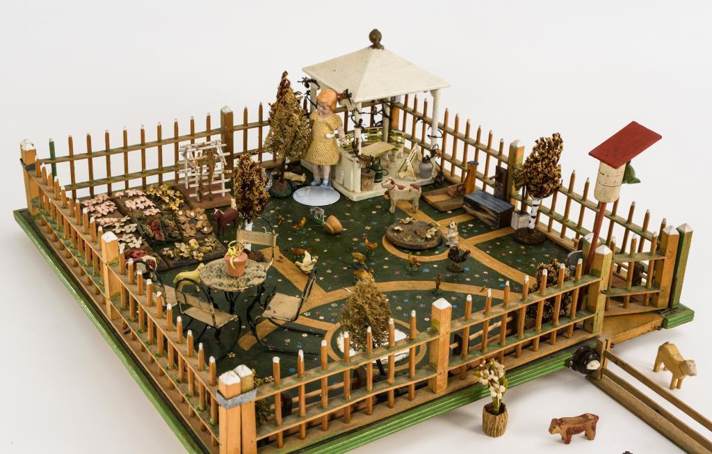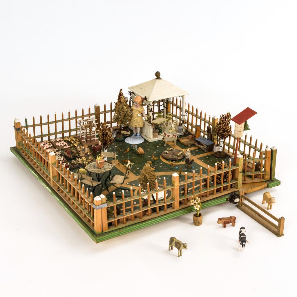 Quadratische Platte mit Umzäunung, gemalten Blümchen und rundem Spiegel als Gartenteich. Dazu Pavillon, 1 Biskuitpüppchen, verschiedene Holz- und Zinn-Tiere, sowie Blumenbeete, Luffabäume und Zubehör. Kleine Defekte.