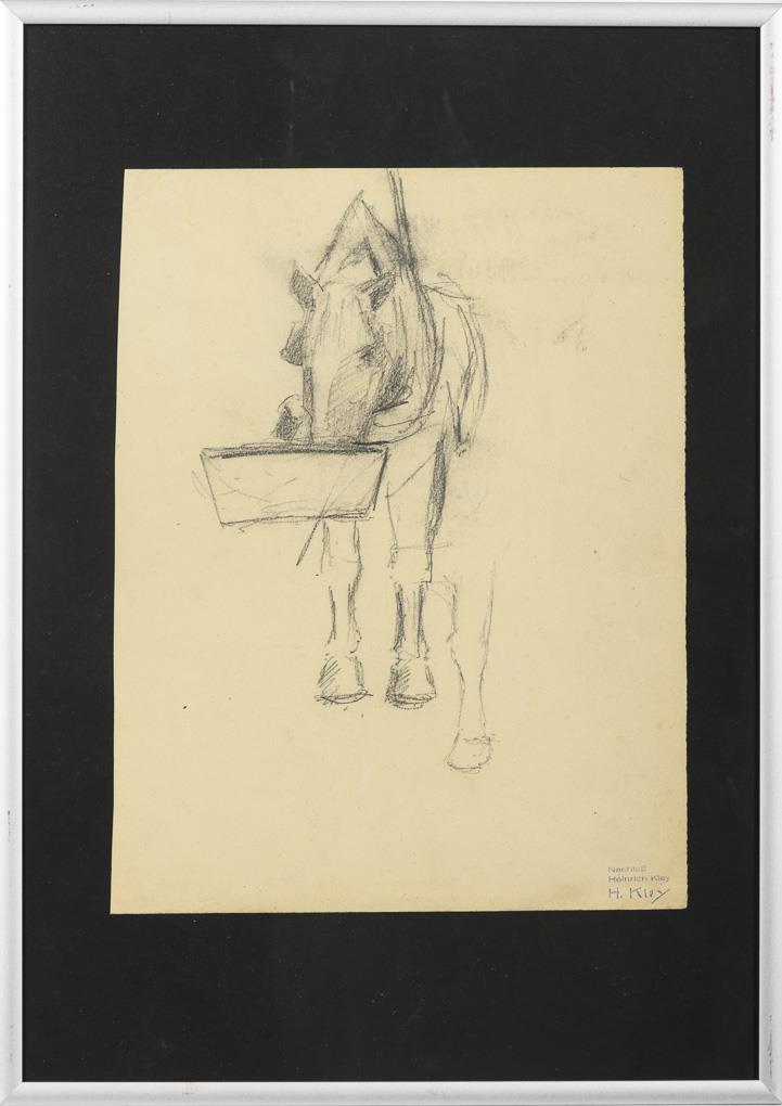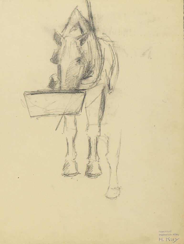 Studie eines Pferdes in Vorderansicht mit Kummet und Tränke. Etwas griffspurig.
