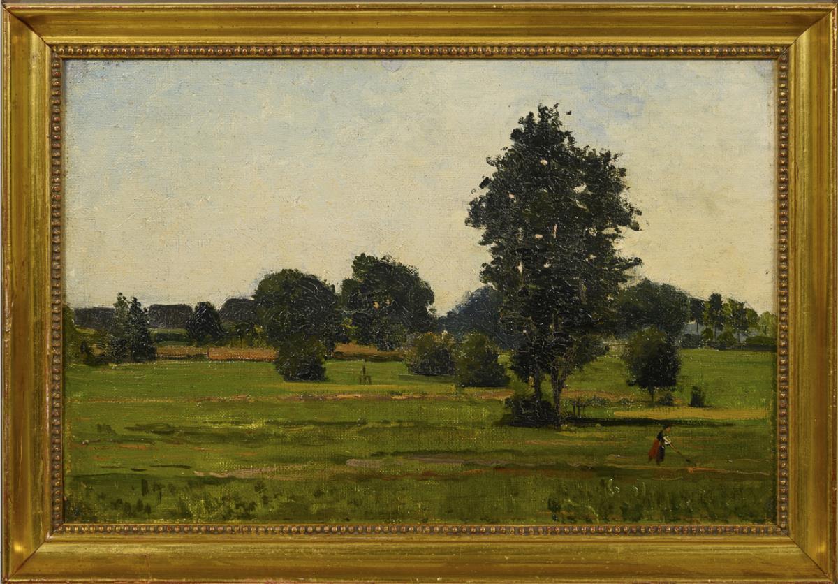 Flache Weidelandschaft mit Staffagefigur auf der Wiese vor den Bäumen und Feldern nahe den Bauernhäusern. Leichte Altersspuren.