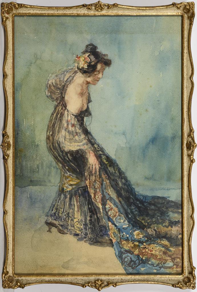 Junge Frau in langem gemusterten Kleid in tanzender Bewegung. Wenig vergilbt.