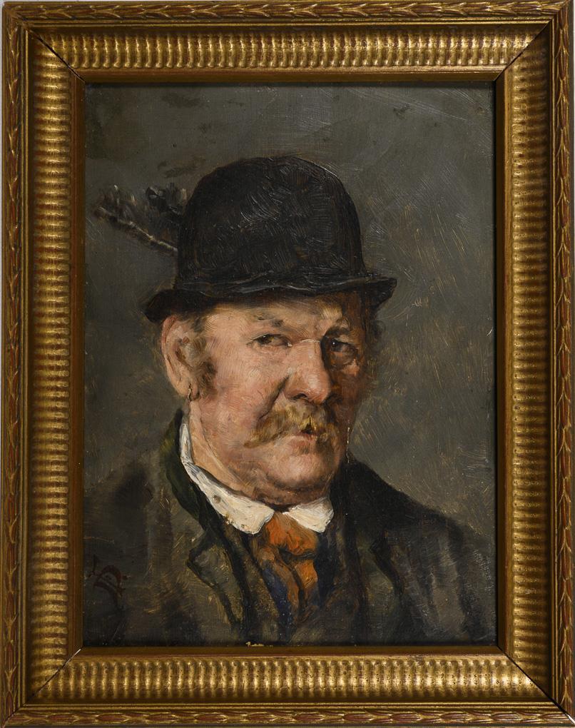 Bildnis eines Mannes mit Schnauzer und Melone vor grauem Hintergrund. Altersspuren.