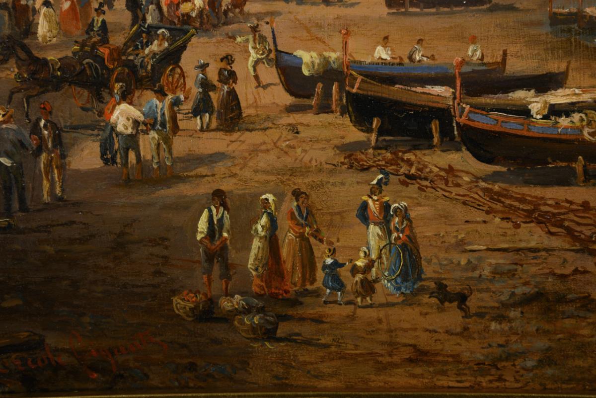 Reges Treiben am Strand nahe den Fischerbooten bei mildem Sonnenlicht mit Blick entlang der Küste mit dem Vesuv am Horizont. Altersspuren.