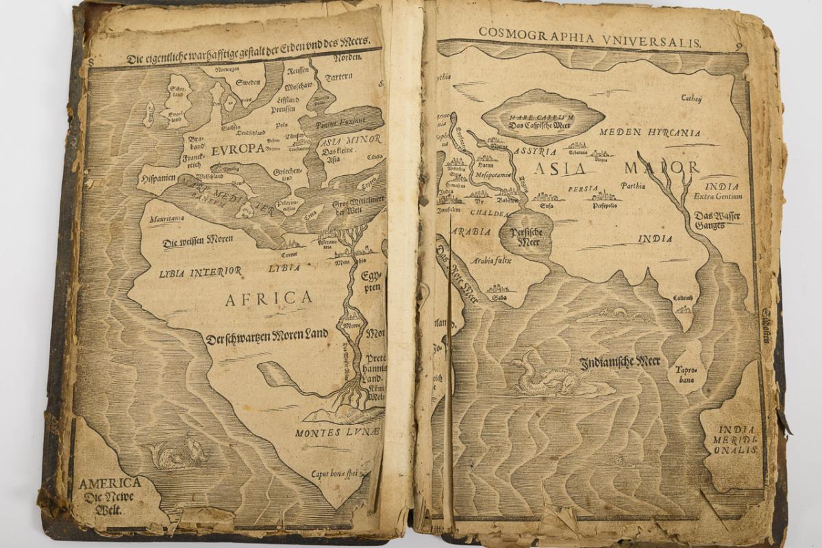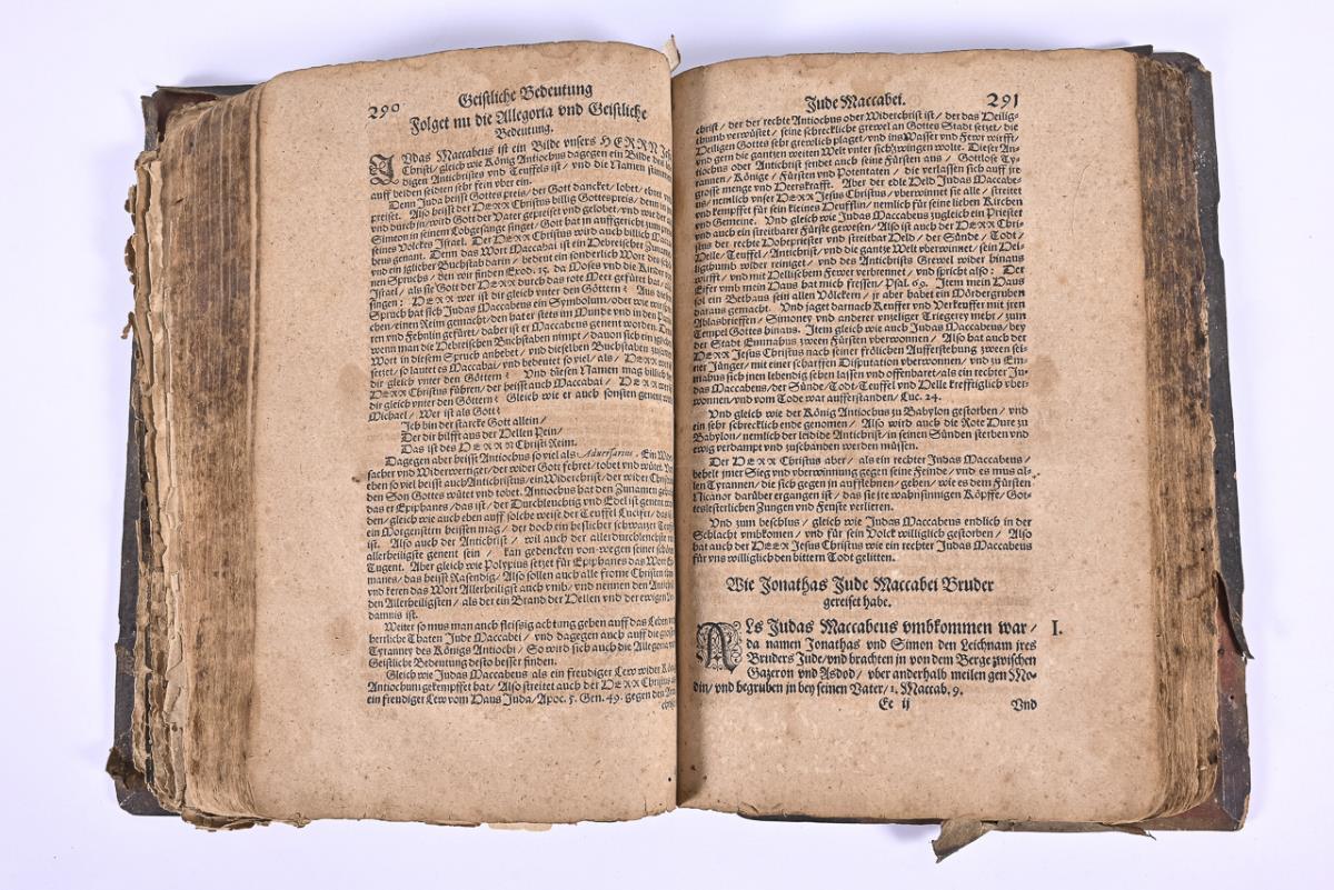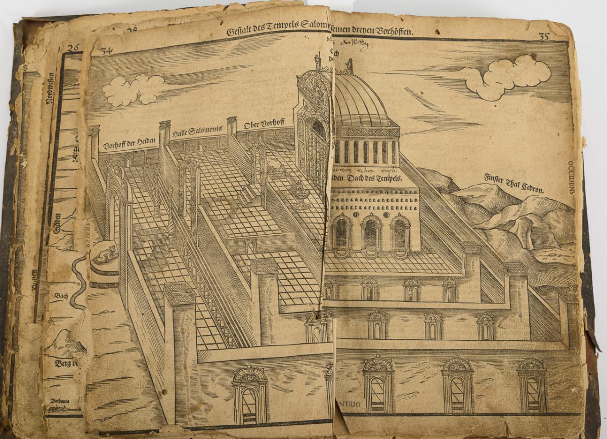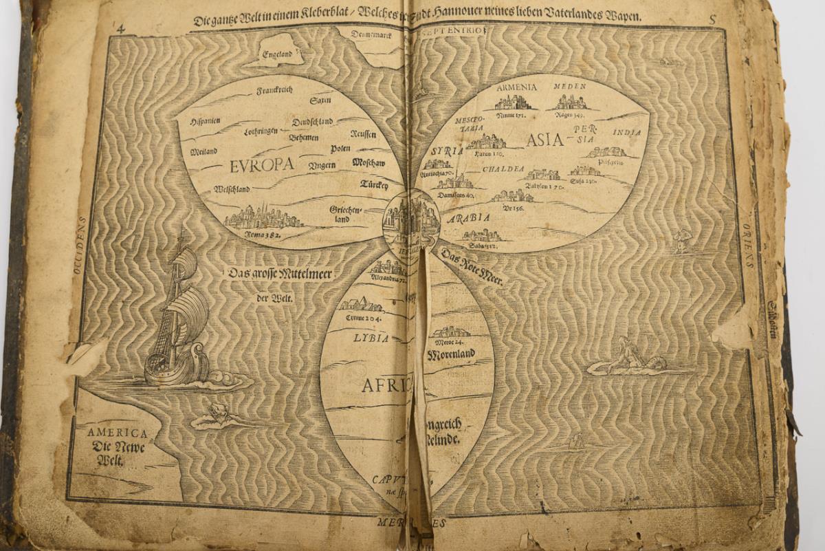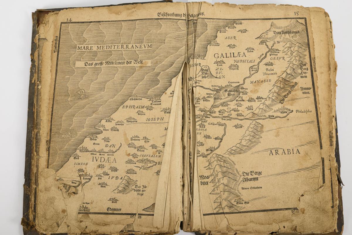 Titelblatt, (12), 6 Karten auf Doppelseiten (darunter eine 'Weltkarte' mit der Andeutung von Amerika, 316, (10) Seiten. Zweiter Teil: Titelblatt, (4) mit einer Karte, 136, (14) Seiten. / Titelblatt: "De Monetis et mensuris sacrae scripturae - Das ist eine eigentliche Ausrechnung und Beschreibung aller Müntz und Masse in heiliger Schrift ...", (5), 32 Seiten (weitere ca. 7 Seiten fehlen). Starke Altersspuren, Gelenk gebrochen, Schließen fehlen, Vorsatz fehlt, Ledereinband mit Fehlstelle. Karten eingerissen, teils lose. Zu Beginn handschriftliche Notizen..
