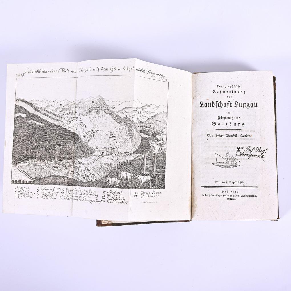 Tafel "Aussicht über ein Teil von Lungau ...", Titel, (8), 66 Seiten und 2 Tafeln mit Statistiken. / "Topographische Beschreibung der Landschaft des Oberpinzgaus im Erzstift Salzburg", Karte "Krimml und der berühmt Wasserfall", Titel, 116, (12) Seiten. "Historisch-topographisch- und ökonomische Beschreibung des Salzburgischen Pfleggerichts Lichtenberg oder Salfelden", Salzburg 1802. (6), 54 Seiten. / "Das Innviertel mit dem Hausruckviertel", Salzburg 1810. 36 Seiten. Im Halbledereinband. Ecken und Kanten etwas berieben, eine Ecke etwas stärker, Vorsatz beschrieben.