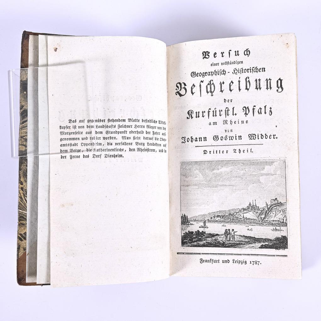 Titel mit Titelkupfer (Oberamtsstadt Oppenheim, ...), 504 Seiten. Inhalt: Das Oberamt Alzei mit seinen Unterämtern Freinsheim und Erbesbudesheim, Das Oberamt Oppenheim, ... Stromberg, ... Bacharach, mit dem Unteramt Kaub, ... Simmern. Halbledereinband.