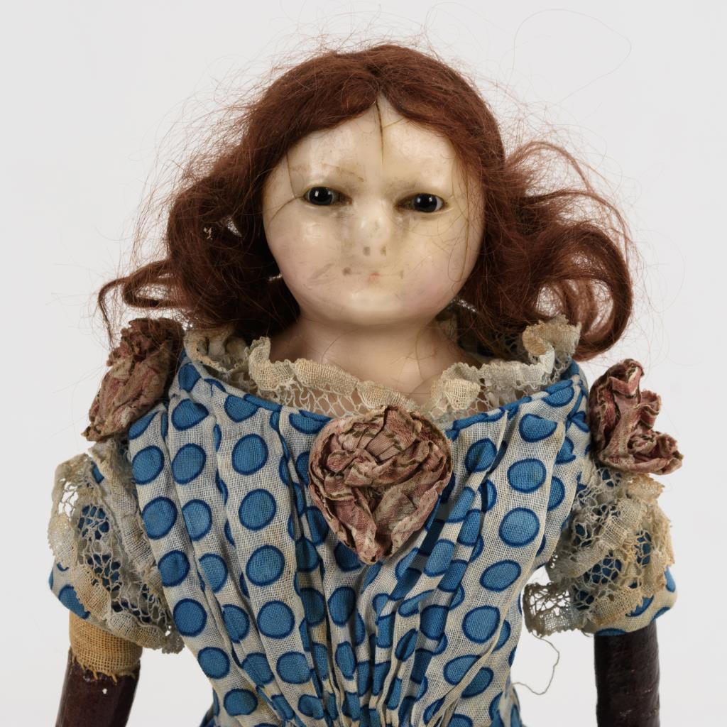 Brustkopf mit braunen Glasaugen und braunen Mohairhaaren. Leinenkörper mit wohl ergänzten einfachen braunen Handschuharmen. Blau gepunktetes Kleid. Trockenrisse am Kopf, Altersspuren.