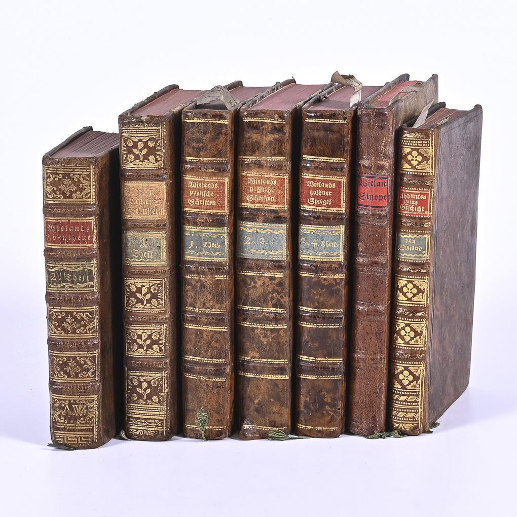 "Sokrates Mainomenos oder die Dialogen des Diogenes von Sinope", Carlsruhe bei Schmieder 1784. / "Die Abderiten", Weimar bei Hoffmann, 1776. / "Die Abenteuer des Don Sylvio von Rosalva" 2. Teil, Leipzig bei Weidmanns Erben, 1772. / "Geschichte des Fräuleins von Sternheim", 1. Theil, Reuttlingen, bey Fleischhauer, 1776. / 2x "Wielands Sammlung poetischer Schriften", Karlsruhe, bey Schmieder, 1776, 1. und 2. Theil. / "Der Goldene Spiegel", 3. und 4. Theil in einem Band, Carlsruhe, bey Schmieder 1777. Alle im Halbledereinband mit Goldprägung, teils ähnliche Rücken. Zeitgemäße Altersspuren.