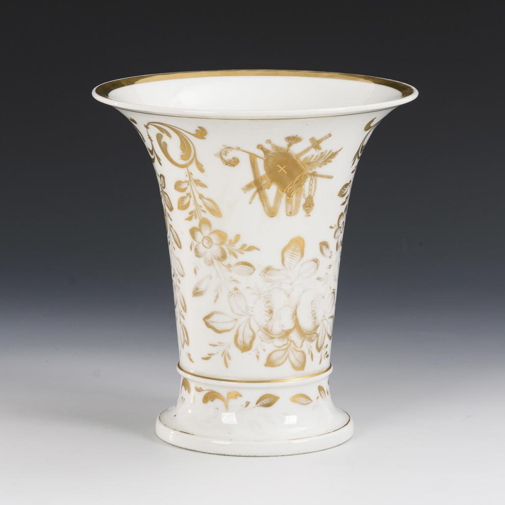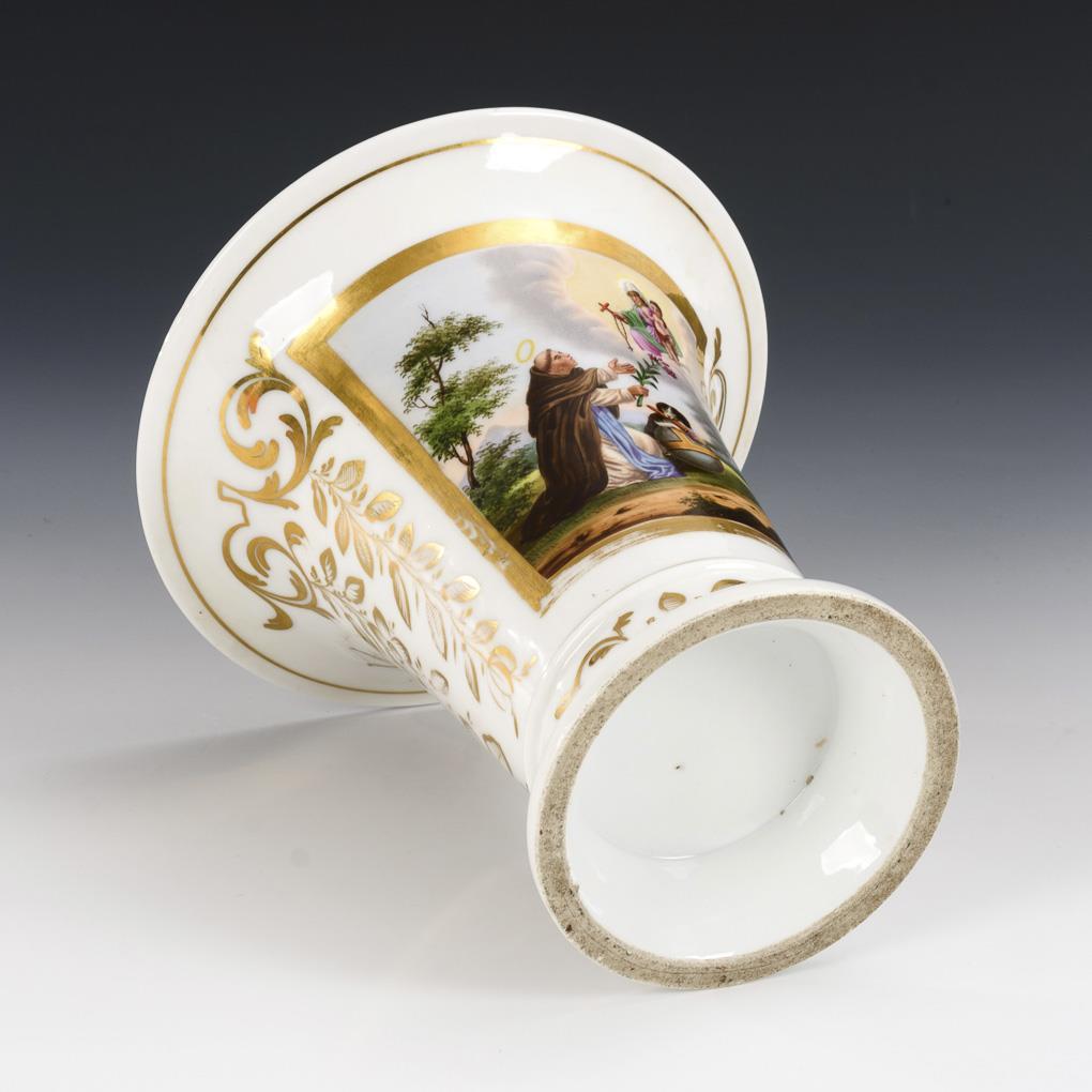Kratervase, schauseitig eine goldgerahmte Kartusche mit der Darstellung einer Vision des heiligen Dominikus, dem die Muttergottes einen Rosenkranz übergibt. Partiell berieben.