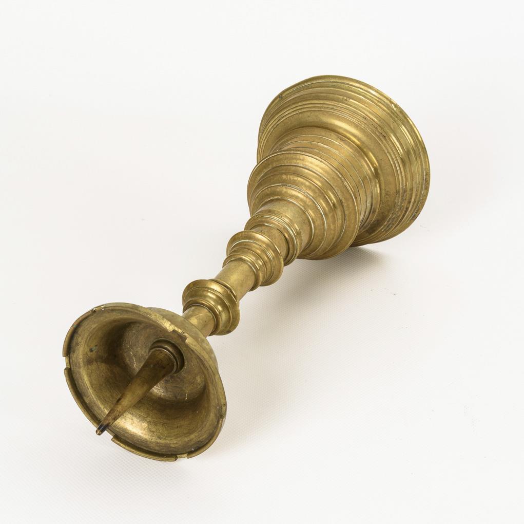 Bronzeleuchter mit gestuftem Fuß, Schaft ähnlich einem Scheibenleuchter und Wachsteller mit Zinnen sowie aufgeschraubter Bronzedorn. Einige wenige Alters-/Gebrauchsspuren.