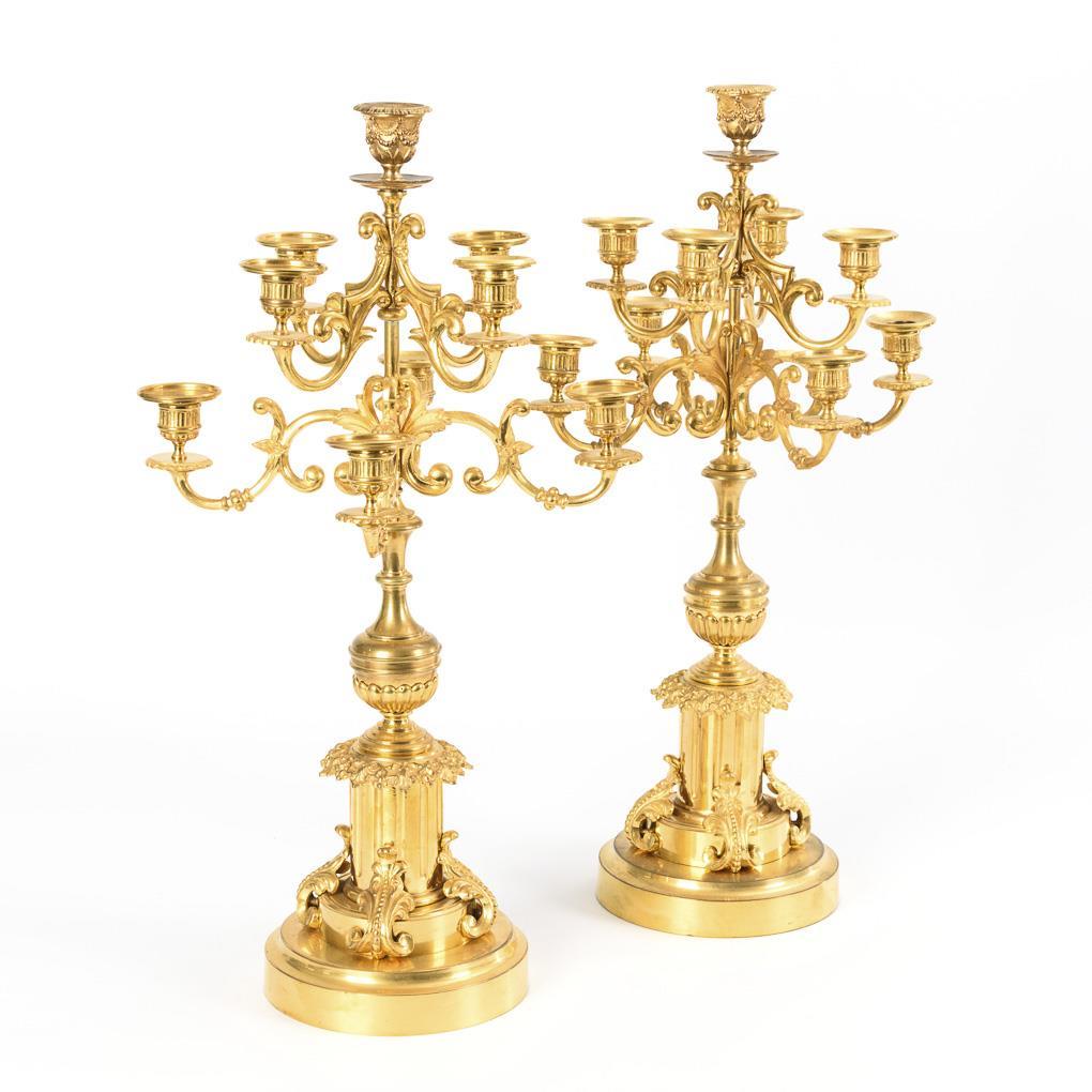 Massive große Kerzenleuchter mit Blattbesatz am Säulenstumpf des Postamentes. Balusterschaft, 2-stufig angebrachte Leuchterarme in Rocaillenform sowie Vasentüllen. Bekrönende Tülle mit Wachsteller je ergänzt.