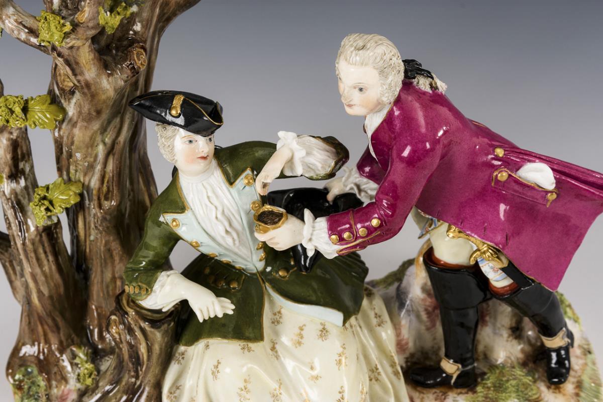 Unter einem Baum sitzende Jägerin sowie ein ihr Schnupftabak reichender Herr. Linke Hand der Dame defekt, Baumstamm restauriert, Deckel der Tabatiere fehlt, Bestoßungen an den Blättern, Degen bestoßen.