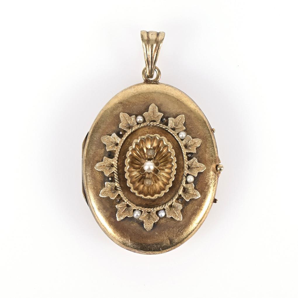 Medaillon schauseitig mit Montierungen und kleinen Perlchen. 2 gerahmt verglaste Innenfächer. 7 Perlchen fehlen.