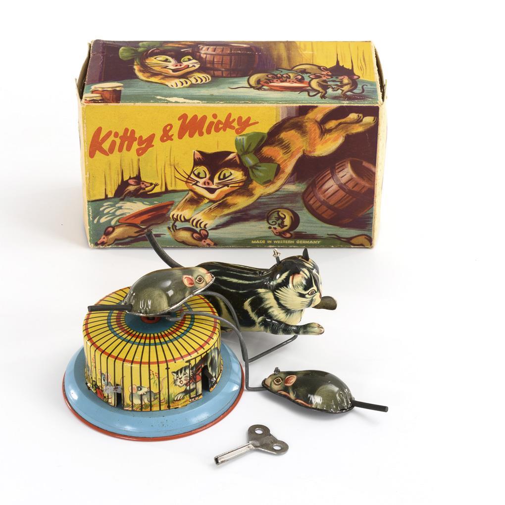 Mechanisches Blechspielzeug mit Katze und 2 Mäusen. Werk intakt, mit Schlüssel. Im Originalkarton. Kaum bespielt.