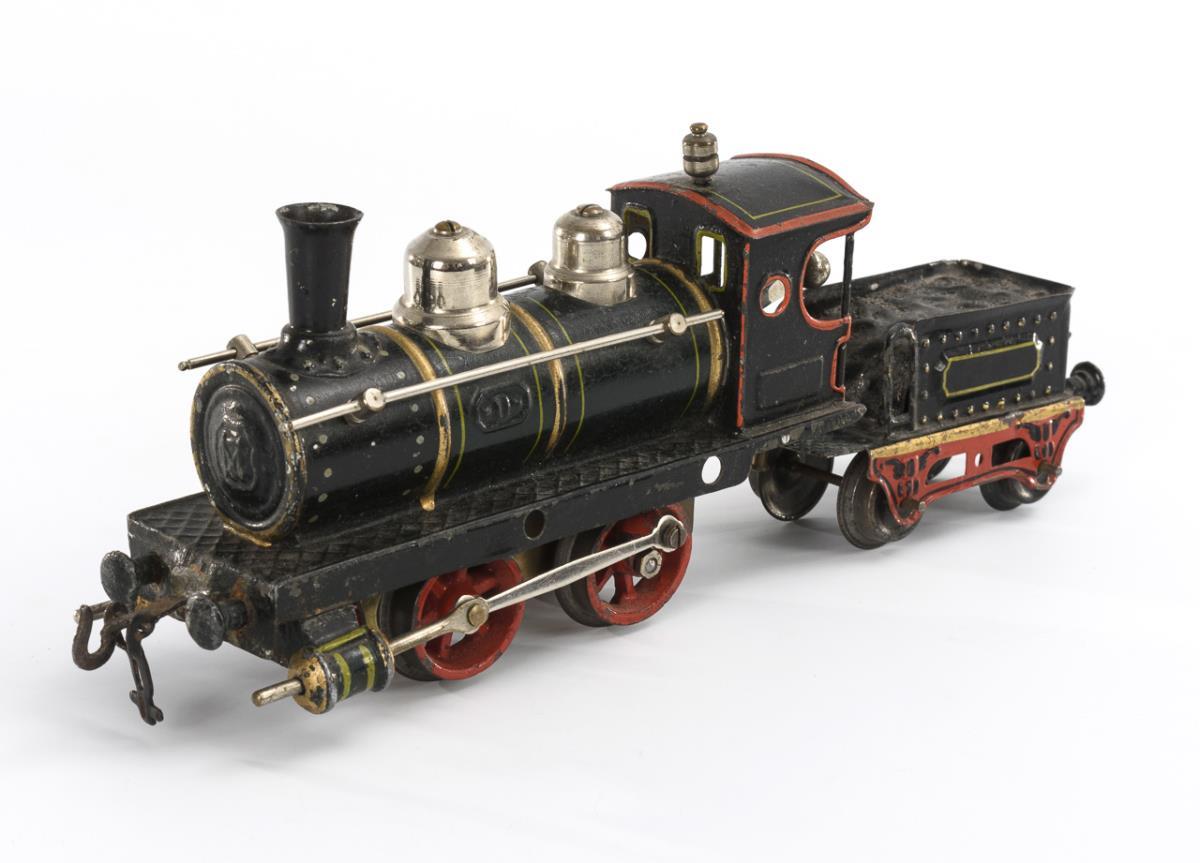 Handlackierte Lok mit Federwerkantrieb. L 17 cm. Dazu Tender (L 9 cm) und 3 seltene Mitropa-Wagen (2x Speisewagen und 1x Schlafwagen mit aufklappbarem Dach, L je 20 cm). Bespielt, mit Altersspuren, Lötstellen, Werk nicht intakt (überholungsbedürftig), Schlüssel fehlt.