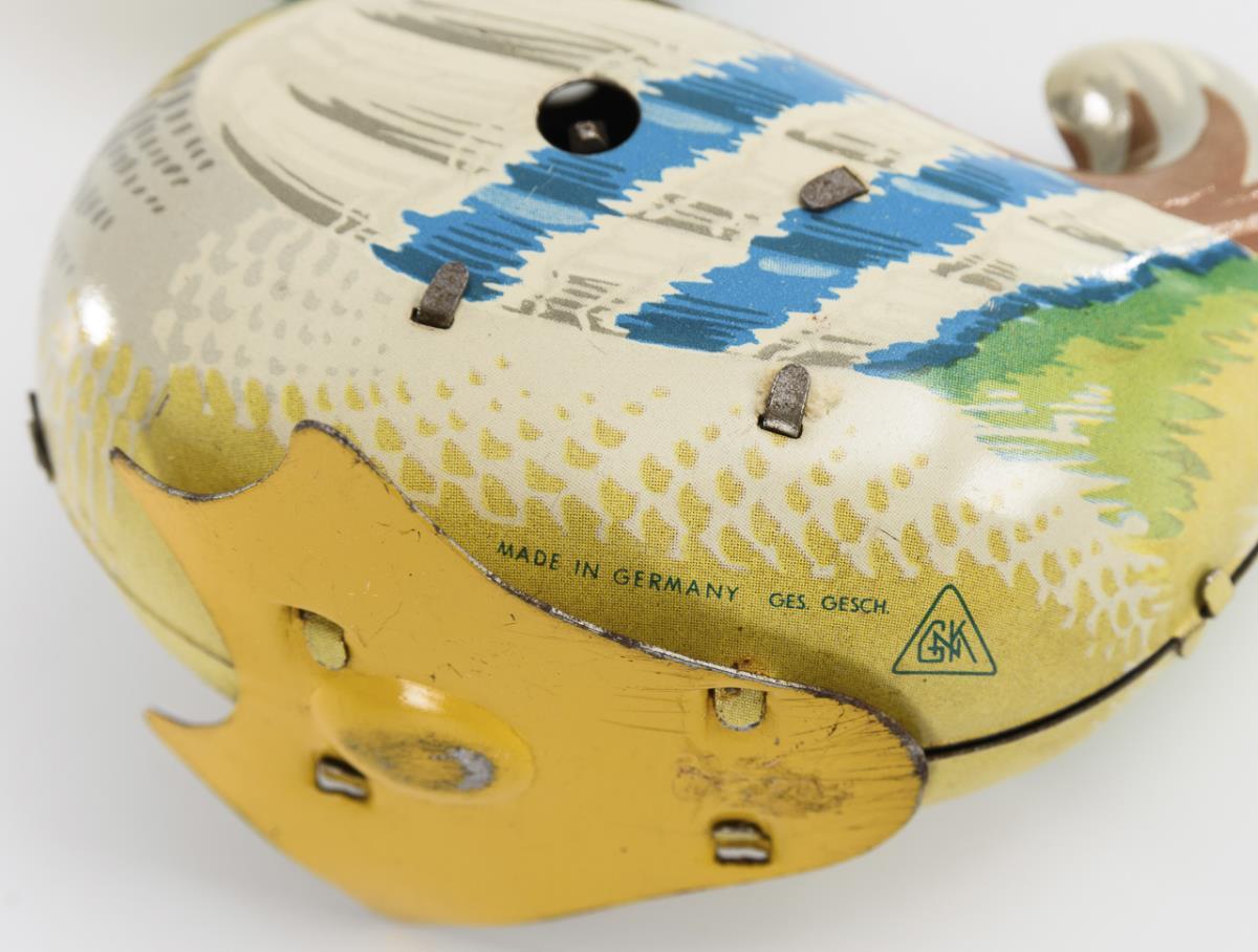Mechanische Blechente mit beweglichem Kopf und Schnabel. 1 Schlüssel. Werk intakt.