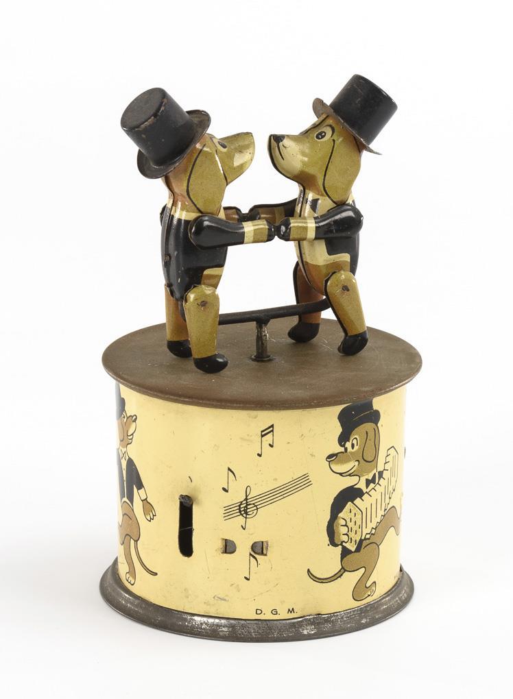Runde Spieldose (ohne Musik), darauf 2 tanzende Hunde mit Zylinder, die sich im Kreis drehen. Werk intakt, Altersspuren und etwas Rost.