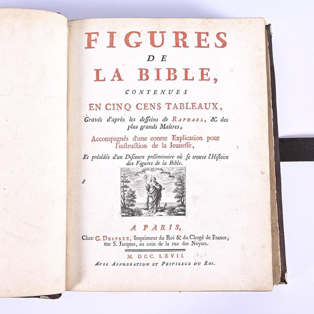 24, 328 Seiten des Alten Testamentes mit je einer halbseitigen Darstellung und 183 Seiten mit 172 halbseitigen Darstellungen des Neuen Testamentes. Jünger in Wildleder nachgebunden mit Schließe und Metallecken.