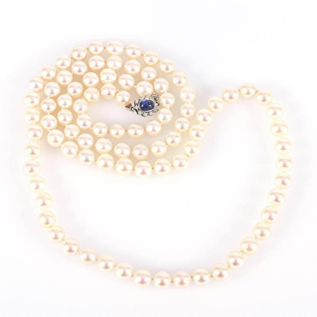 Schnürkette mit Zuchtperlen in Einzelverknotung, an Zierschließe mit Saphircabochon und 10 kleinen Brillanten.