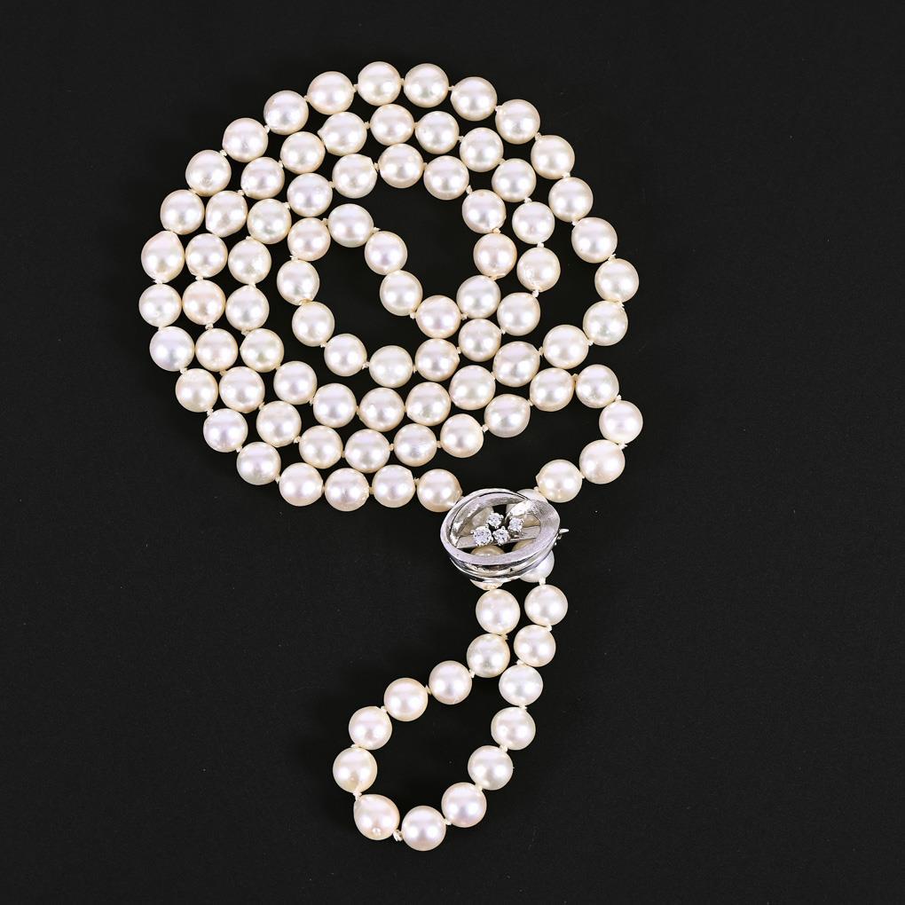 Durchgehende Schnürkette mit Zuchtperlen in Einzelverknotung. Brosche mit 4 chatongefassten Brillanten. Kugelhaken.