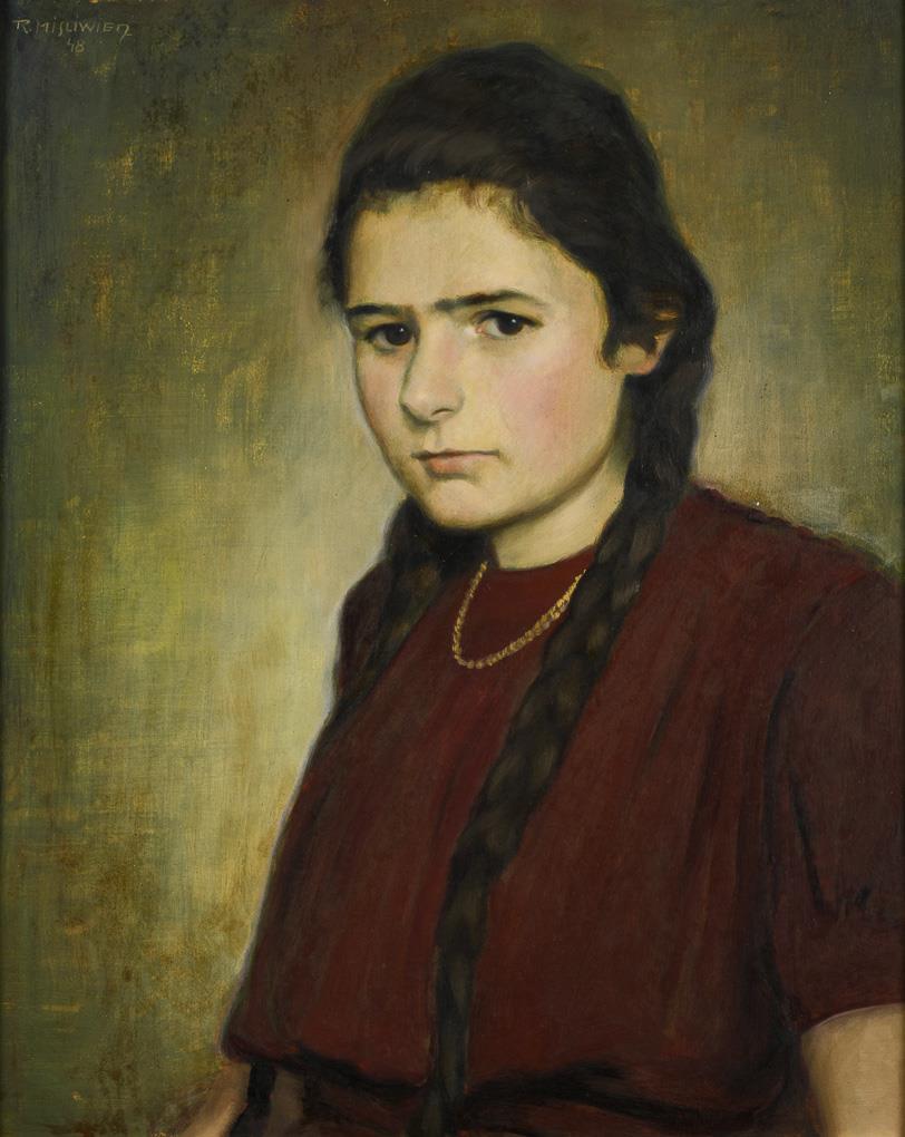 Porträt einer jungen Frau im roten Kleid mit langen Zöpfen.