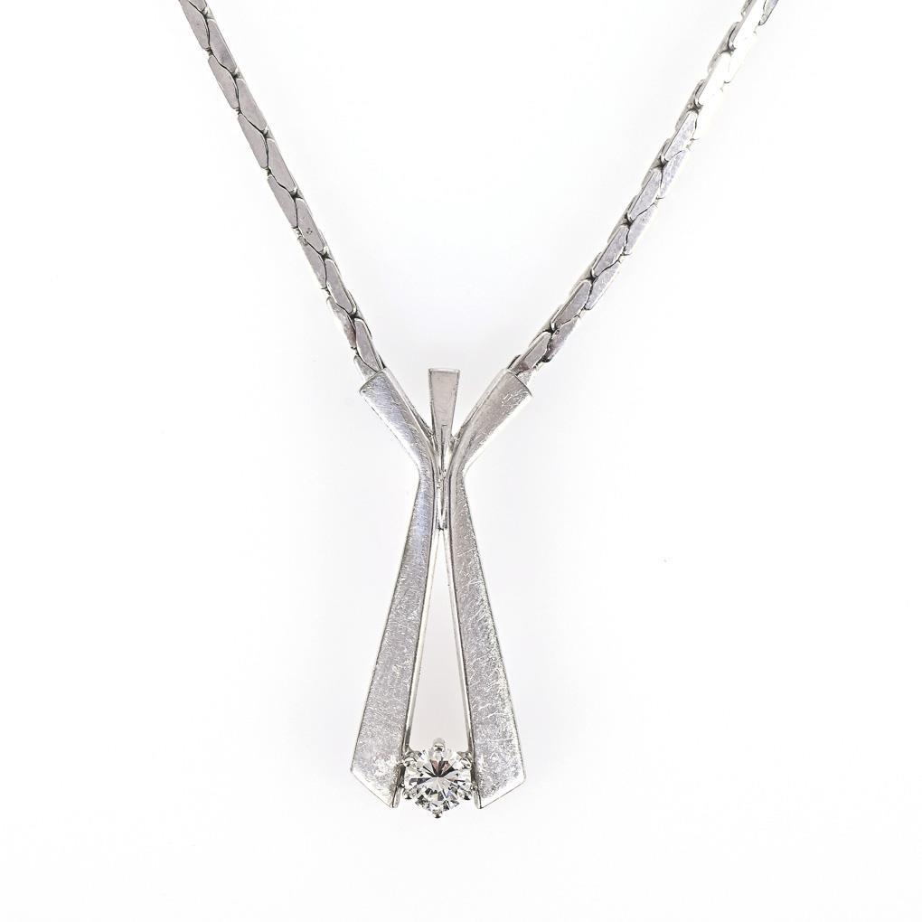 Weißgold 585 gestempelt. Mitte 3 x 1,3 cm. L 38,5 cm. Brillant ca. 0,40 ct. 12,5 g.