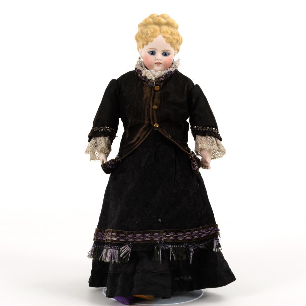 Brustkopf, feste blaue Augen (wohl nachgeklebt), offen-geschlossener Mund mit gemalten Zähnen, modellierte blonde Haare, Ohrringe. Lederkörper in schwarzer Kleidung mit Schürze. Kopf am Hals geklebt, Körper mit Reparaturen, Hände defekt.