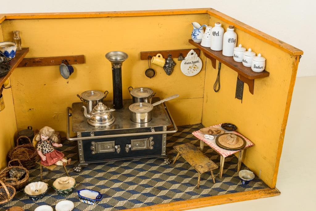 Trapezförmiges Holzgehäuse, Blechherd Märklin? mit wohl originalen Töpfen. 3 frühe Blechmöbel (1 Stuhlbein fehlt). Diverses Zubehör, darunter Öl- und Essigbehälter sowie 3 Döschen aus Porzellan.