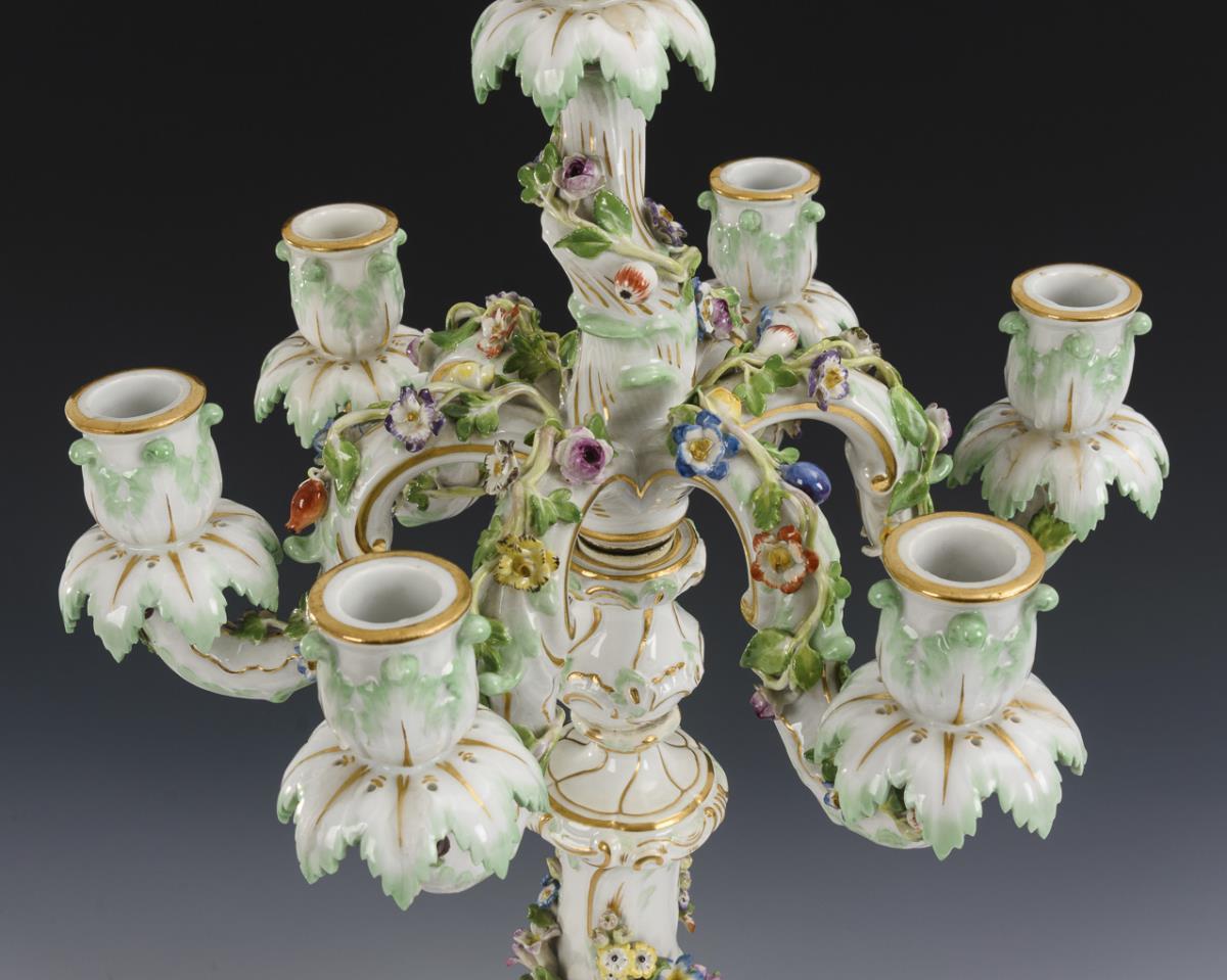 7-flammiger Leuchter mit blütenbelegten Leuchterarmen, Rocailleschaft sowie drei, auf einem blütenbelegten Sockel sitzenden, musizierenden Putten. Geigenkopf fehlt, kleine Bestoßungen am Blütenbelag, Flöte und Violinenbogen bestoßen.
