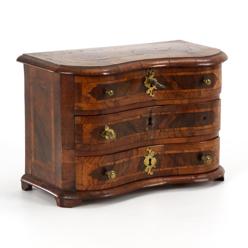 3-schübige Kommode mit marketierten Scheinkassetten. Alters-/Gebrauchsspuren, teils fehlende bzw. ergänzte Beschläge, wenige Furnier-Ergänzungen, geringe Anobienspuren, verschlossen, nicht passender Schlüssel.