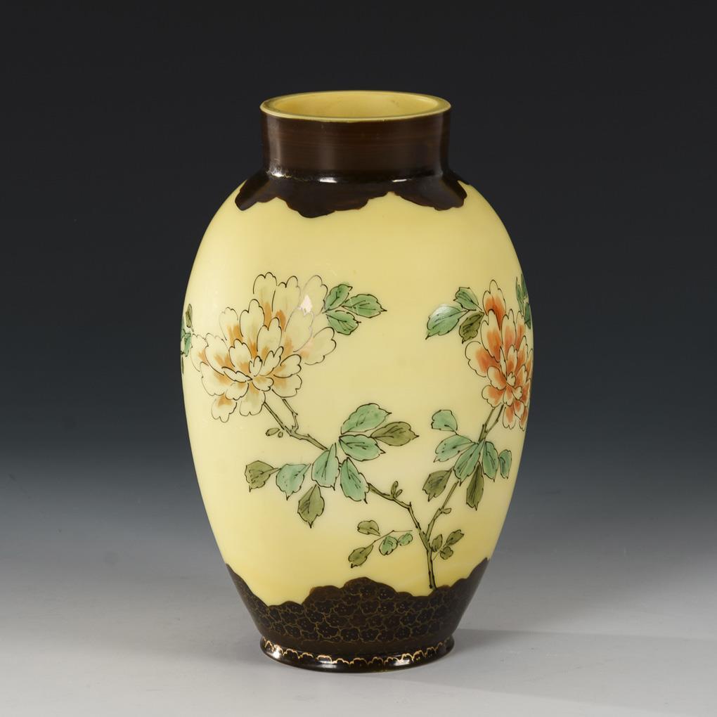 Gelbopakes Glas mit weißen Schlieren, Goldstaffage. H 17,5 cm.