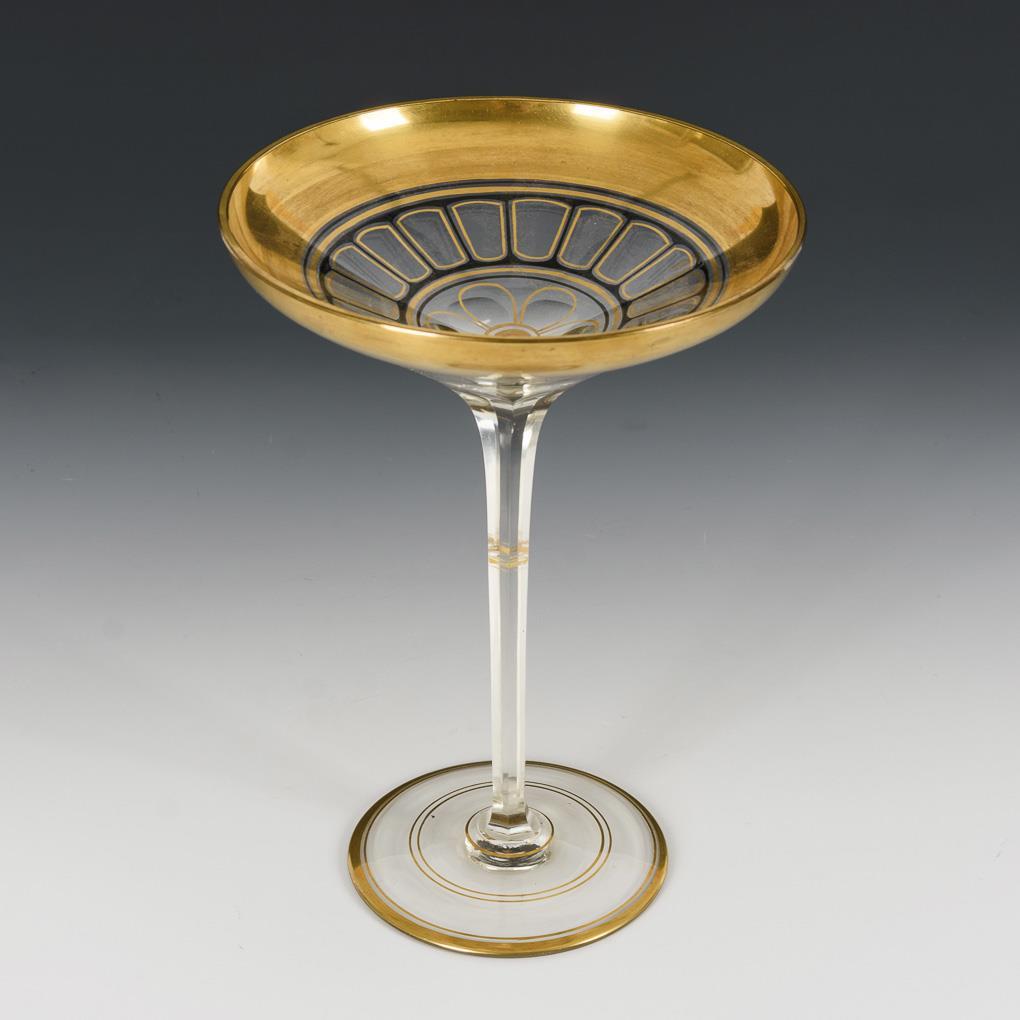 Am Ansatz facettierte flache Schale, auf hohem, facettiertem Stängel, Rundfuß.