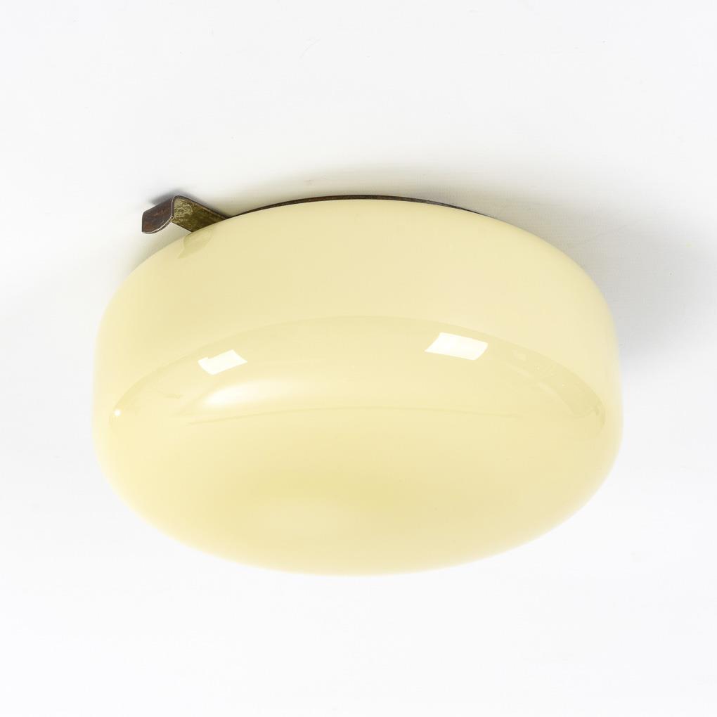 Glashalter aus Eisenblech mit Patentschiebeverschluss und weißem Opalglaskörper mit bernsteinfarbenem Überfang. H ca. 9 cm, Ø ca. 24 cm.