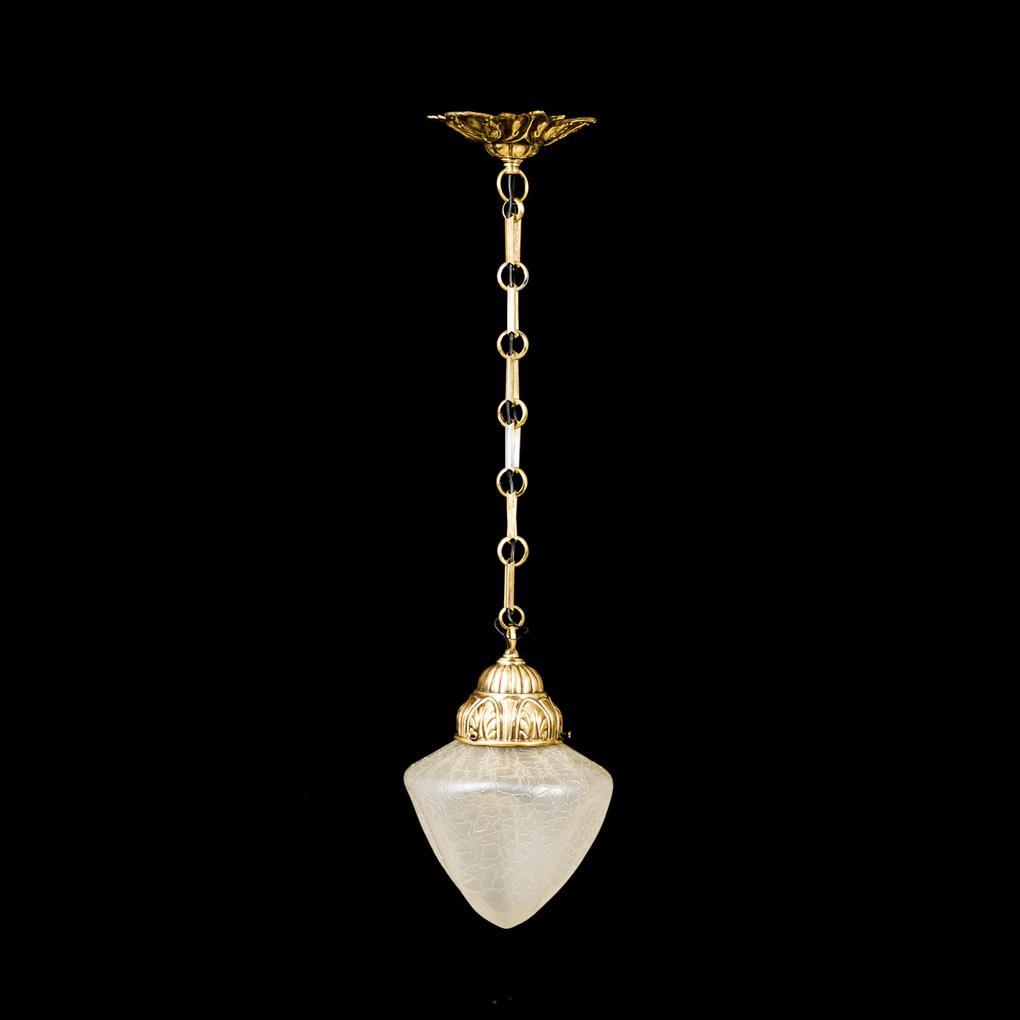 1-flammige Hängelampe an Kettenaufhängung mit Lorbeerbaldachin, organisch geformter Glaskörper aus satiniertem Astglas. Metall mit Korrosionsspuren, Glasrand mit Chips.