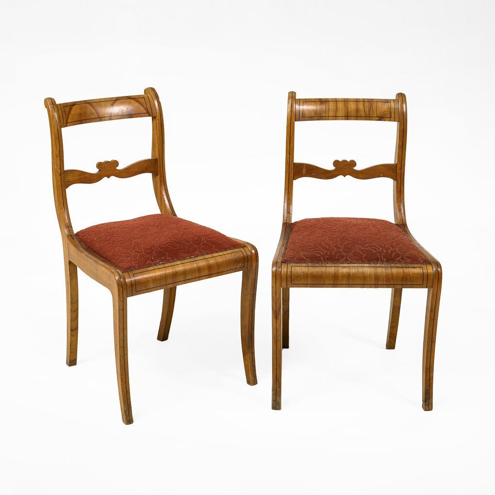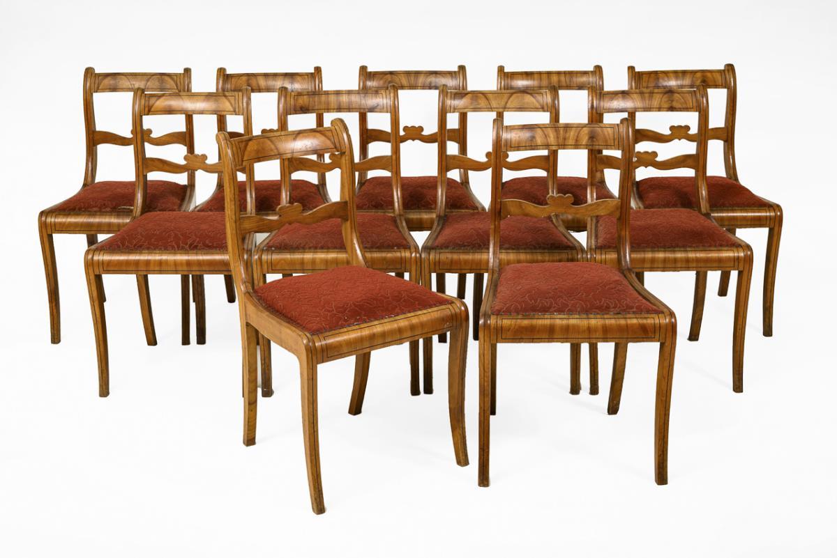 11 Lehnstühle mit gepolsterter Sitzfläche, durchbrochene Rückenlehne mit geschweiftem Mittelsteg und Schulterbrett, dekoriert mit ebonisierten Fadenintarsien; roter Samtbezug mit Floralmuster und Ziernagelung. Alters-/Gebrauchsspuren, inaktiver Anobienbefall.