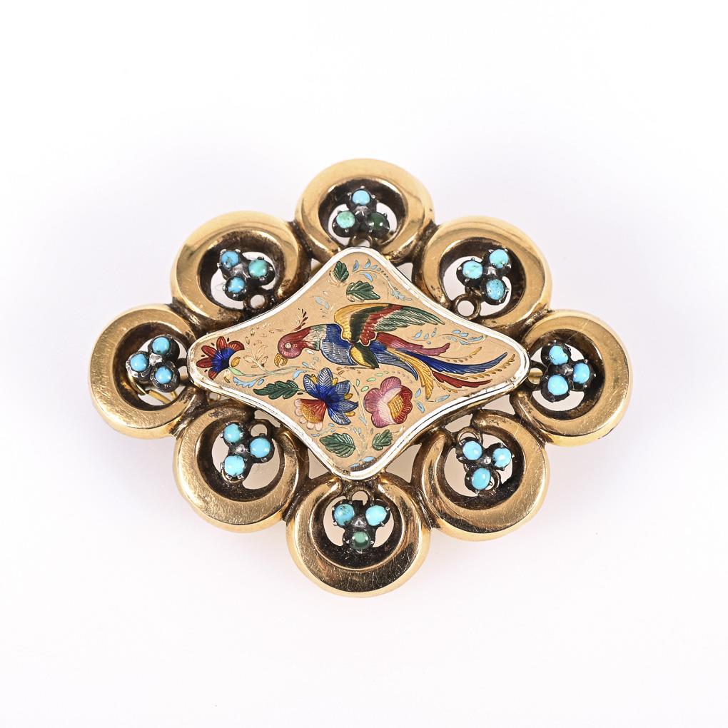Biedemeierbrosche mit Email und Türkisen.