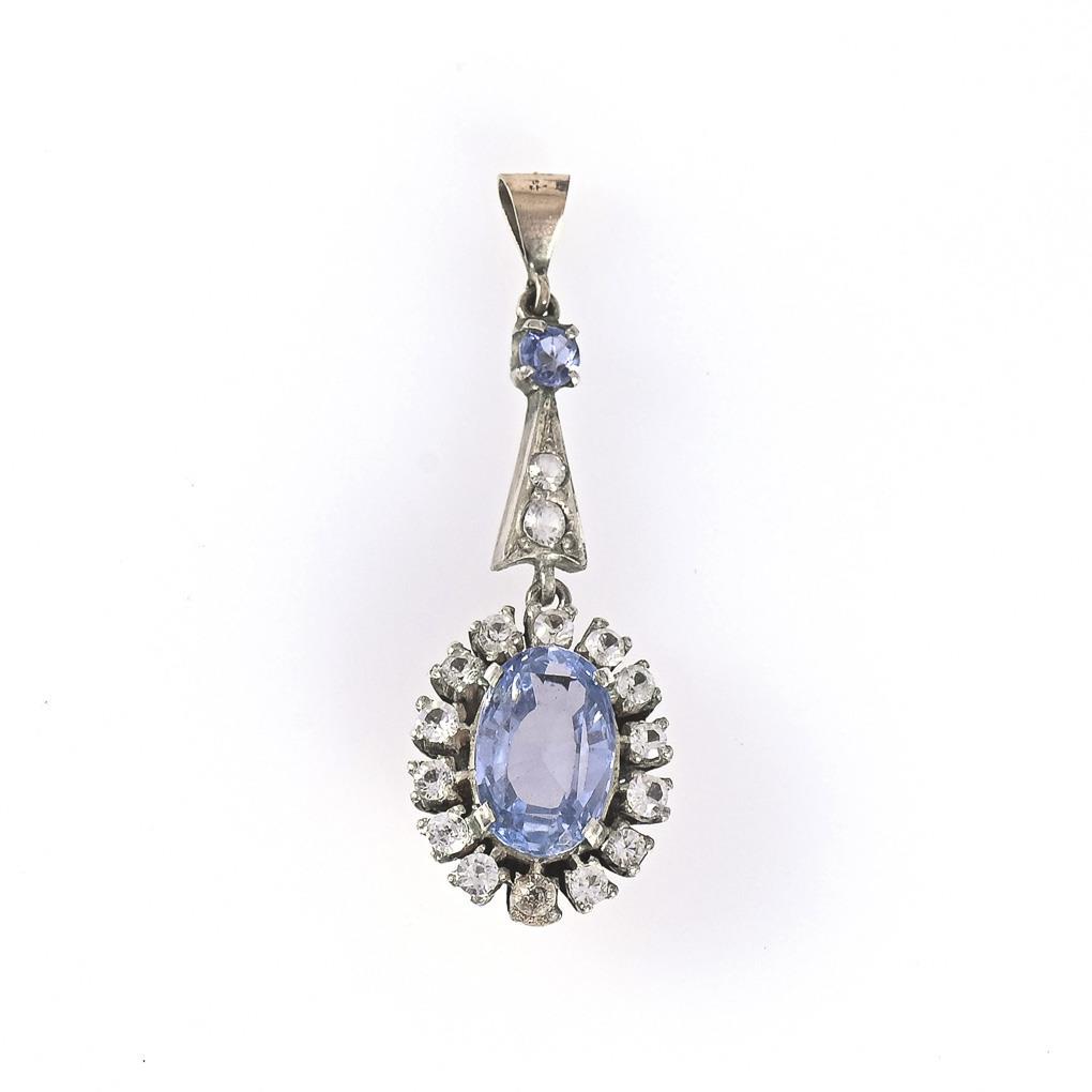 Abgehängter, krappengefasster hellblauer Stein, umringt von farblosen Steinen. 1 farbloser Stein eingeklebt.