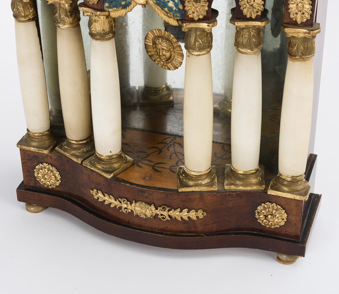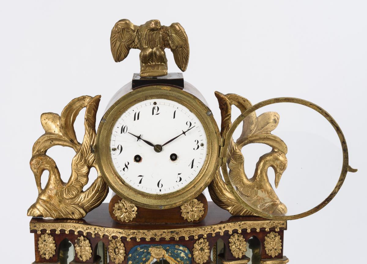 Portaluhr mit Säulenportikus und verspiegelter Rückwand, bekrönender Uhrentrommel mit Adler und flankierenden Schwänen. Altersspuren und Defekte, restaurierungsbedürftig.