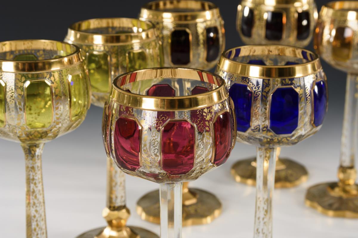 Farbloses Glas mit verschiedenfarbigem Überfang, Goldstaffage. H 20 cm.