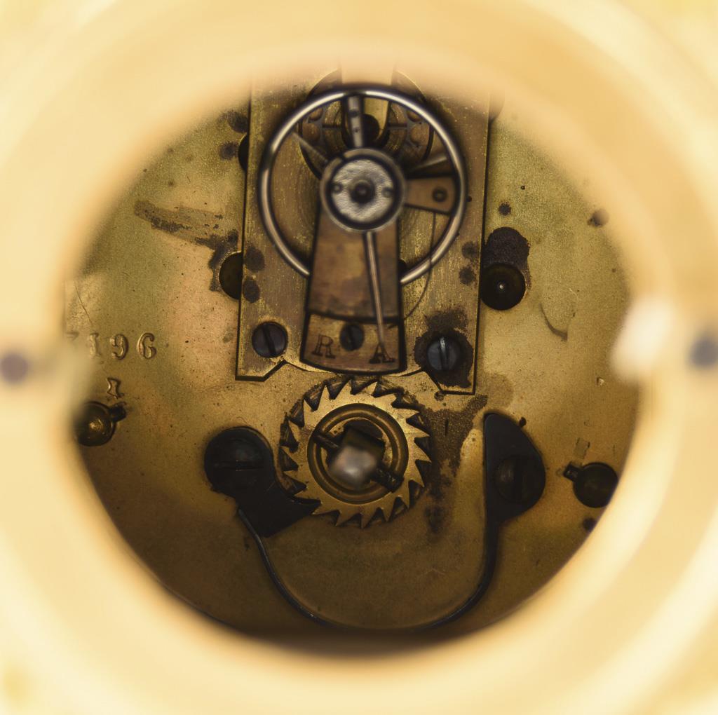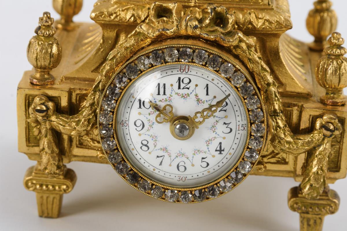 Ungemarktes Werk mit Zylinderhemmung, Schlüsselaufzug, läuft. Weißes Emailzifferblatt mit farbiger Festonmalerei, arabischen Zahlen, Minutenkranz und Louis XVI-Zeigern. Steinbesetzte Lünette.
