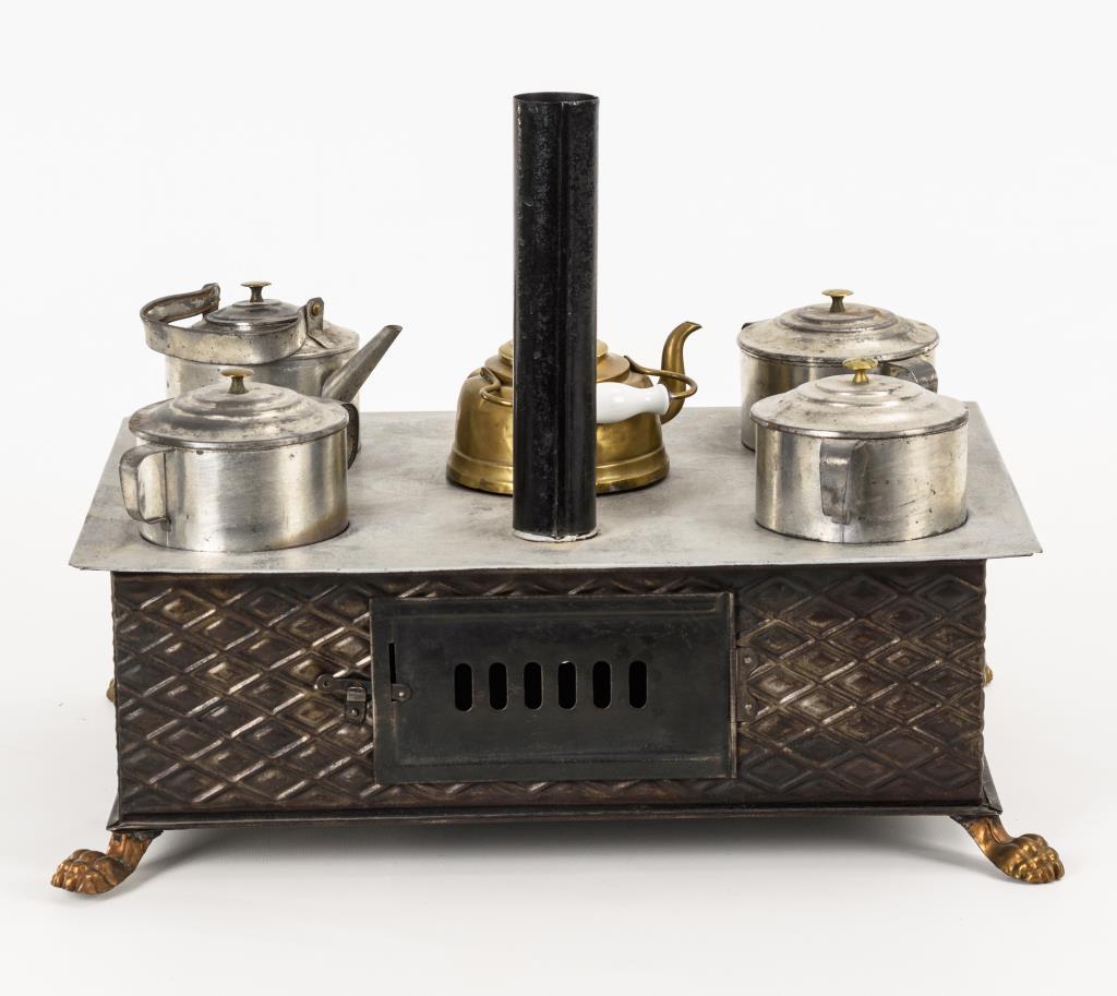 Herd mit geprägtem Kachelmuster, 2 reliefierten Fronttüren und herausziehbarem Wasserschiff ohne Hahn. Auf 4 Tatzenfüßen. Mit 5 Kochstellen und Kochgeschirr. Bespielt, mit Altersspuren. Kochgeschirr mit Defekten und Lötstellen. Schlothut fehlt.