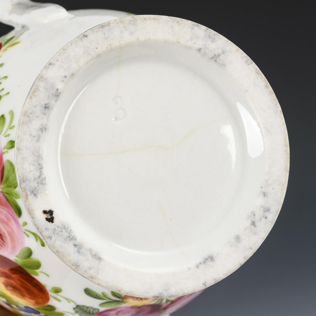 Birnkannen mit Tierkopf-Röhrenausguß und Knaufdeckel. Mit Rosen- und Vergißmeinnichtkränzen, darin die Inschriften "Freundschaft ist die Lebens Sonne / welche niemals Undergeht" sowie "Geniese froh dein Leben / Keine Rose ohne Torne". Minimaler Goldabrieb, 1x kleiner Haarriss im Stand und Chip am Deckelrand, 1x Haarrissspinne im Boden.