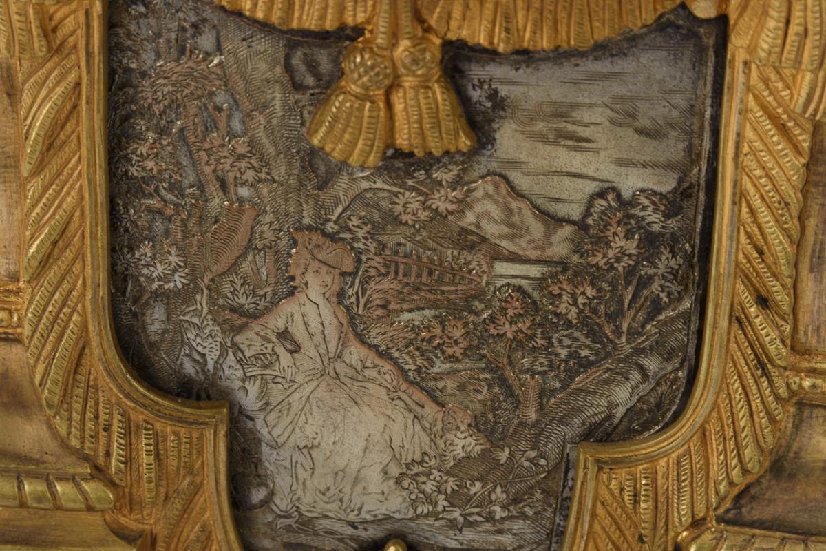 Prunkvolles Rundbogengehäuse mit Vasenbekrönung im Barock-Stil, schauseitig ein Kupferrelief mit in Landschaft sitzender Dame. Auf flachem, stuckvergoldetem Holzsockel mit hellblauem Samtbezug. Leichte Alters- und Gebrauchsspuren, partiell Defekte.