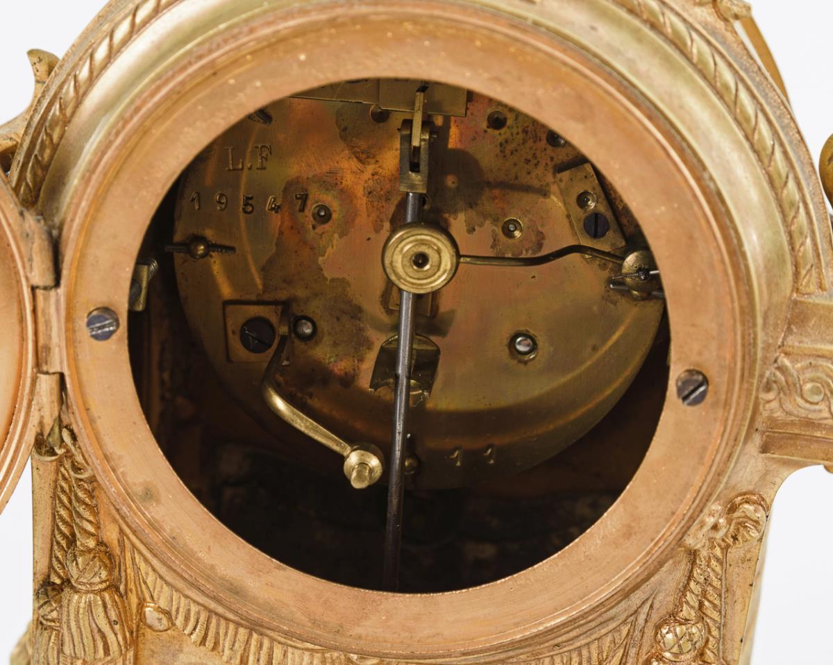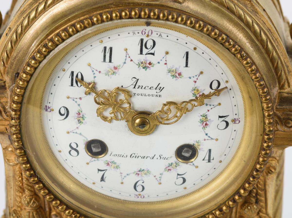 Gemarktes Werk mit Halbstundenschlag auf Glocke, revisionsbedürftig. "Ancely Toulouse, Louis Girard Suc[cesseu]r" bezeichnetes, weiß emailliertes Zifferblatt mit farbiger Festonmalerei, arabischen Zahlen, Minutenkranz und Louis VX-Zeigern.