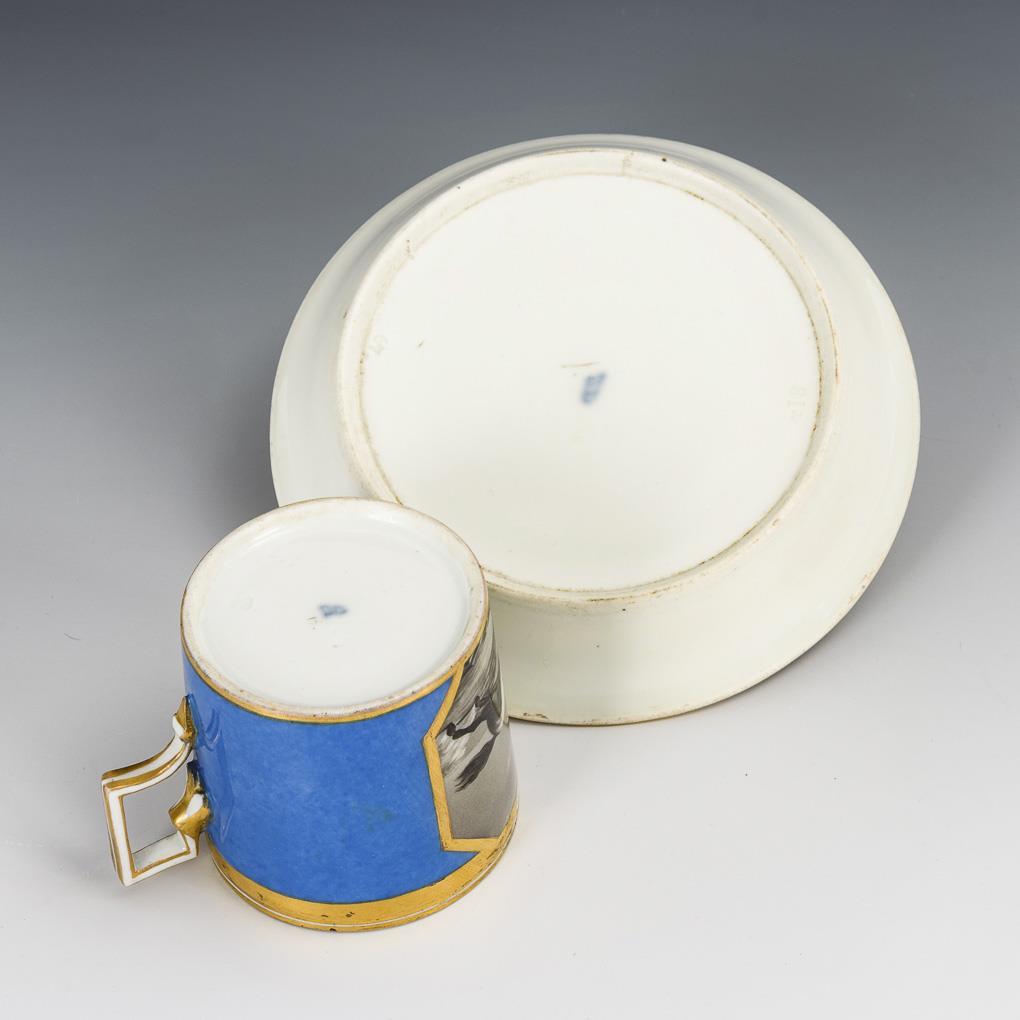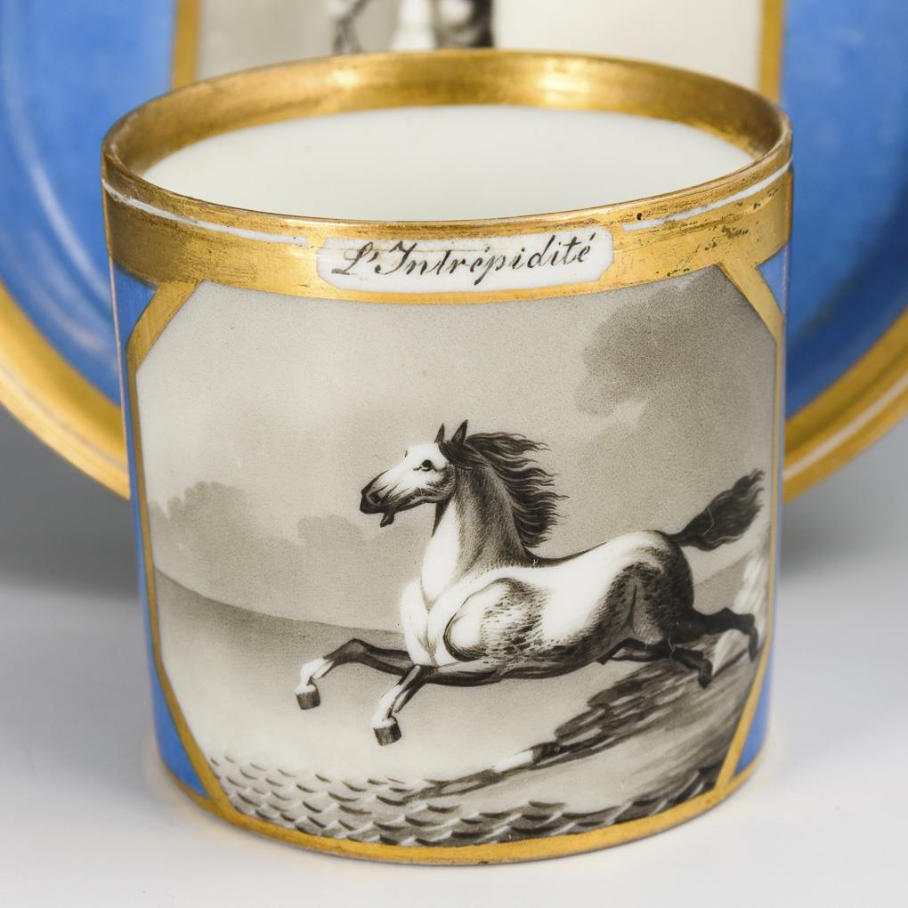 Zylindertasse mit gewinkeltem Henkel. Blauer Fond, schauseitig auf der Tasse die schwarzlotgemalte Darstellung eines galoppierenen Pferdes, bezeichnet "L'Intrépidité" (Die Unerschrockenheit), im Spiegel der Untertasse die Darstellung eines antiken Mannes mit Helm und zwei Pfeilen, bezeichnet "La Dialéctique" (Die Dialektik). Goldretusche am Tassenrand, Untertassenspiegel mit Bereibungen.