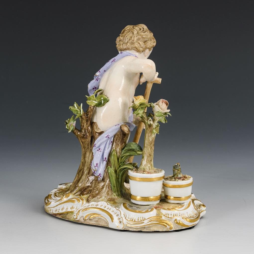 Vor zwei Rosenstöcken stehender, den Garten umgrabender Putto. 1 Rosenstock fehlt, einige Blätter bestoßen.